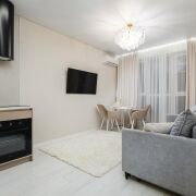 -В ремонте использованы светлые тона - мягкие бежевые, кремовые и серые оттенки визуально расширяют пространство и создают ощущение комфорта. Стены идеально выровнены, потолки натяжные с врезанными LED-светильниками, что даёт равномерное освещение без бликов.