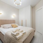 -В спальне продумано сочетание мягких текстур и точечных акцентов: текстильные шторы в пол, кровать с мягким изголовьем, уютное освещение бра и дизайнерская люстра. Установлен вместительный шкаф и кровать с подъёмным механизмом.