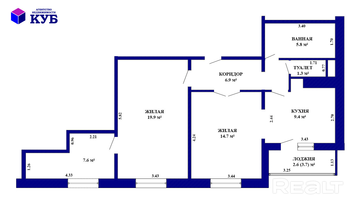 ✔ гостиная - светлая, площадью 14,7 м2; спальня - очень комфортная – 19,9 м2, из которой попадаем в «хооби-комнату» 7,6 м2, которую можно переоборудовать по под рабочий кабинет либо отдельную детскую комнату. Высота потолков - 2,63 м.