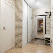 - Коридор с плиточным покрытием и декоративным камнем на стенах дополняет встроенный шкаф-купе и металлическая шумоизоляционная дверь, делая пространство функциональным.