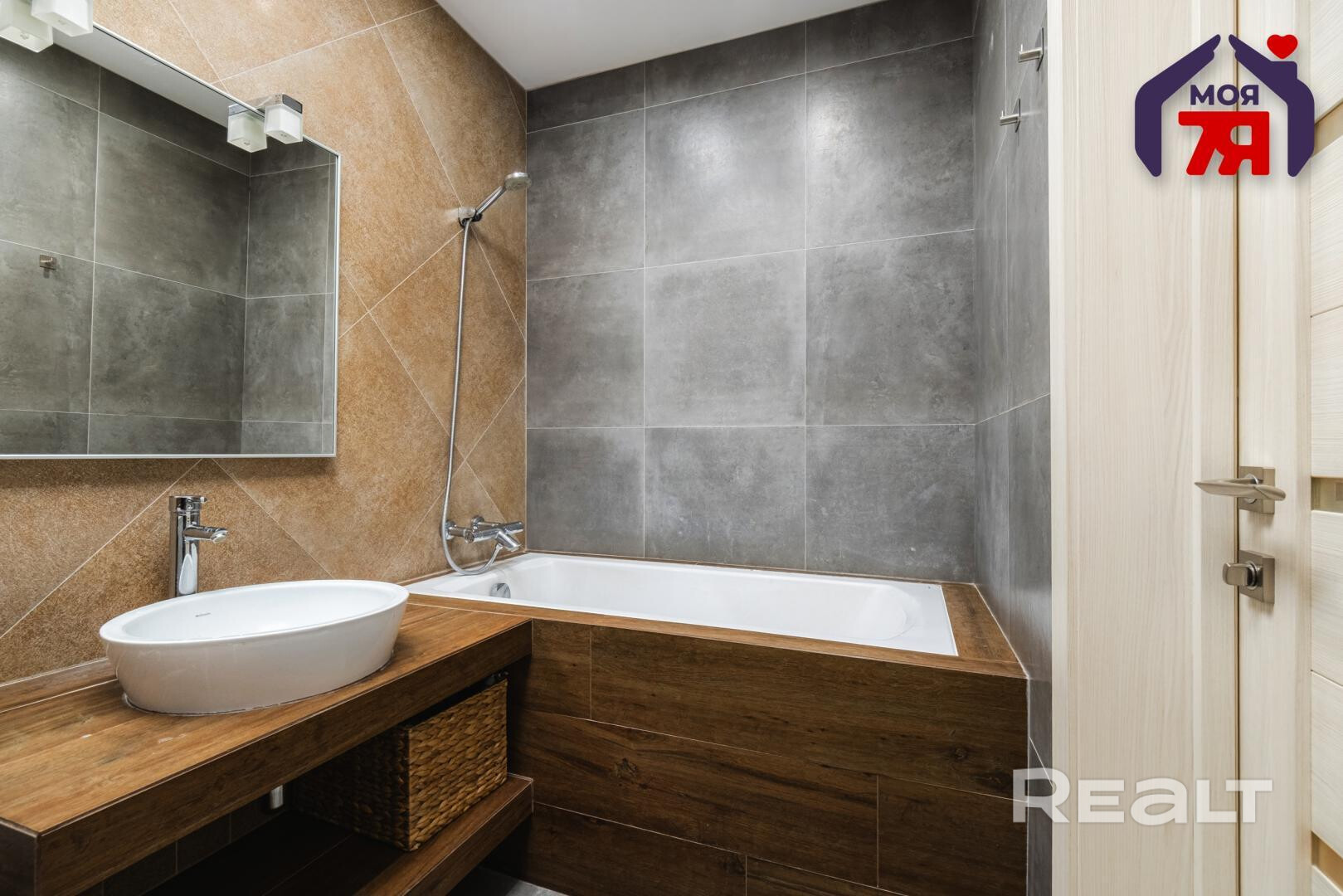 - Совмещенный санузел отделан плиткой, оснащен акриловой ванной, дорогой сантехникой и теплым полом. Бойлер и стиральная машина остаются.