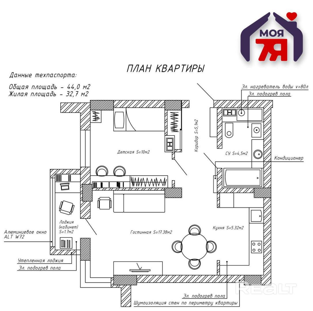 - Общая площадь квартиры составляет 42,3 кв.м, жилая площадь 32,7 кв.м, а площадь кухни 5,3 кв.м. Рациональная планировка позволяет эффективно использовать каждый квадратный метр.
