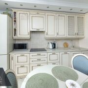 Вся мебель изготовлена по индивидуальному заказу из березы, гармонично вписывается в общий стиль интерьера и дополнена стильными элементами декора, создающими атмосферу уюта для отдыха и встреч с гостями. Натуральный паркет и деревянные дверные блоки подчеркивают качество отделки. В кухне, санузле и ванной использована испанская плитка.