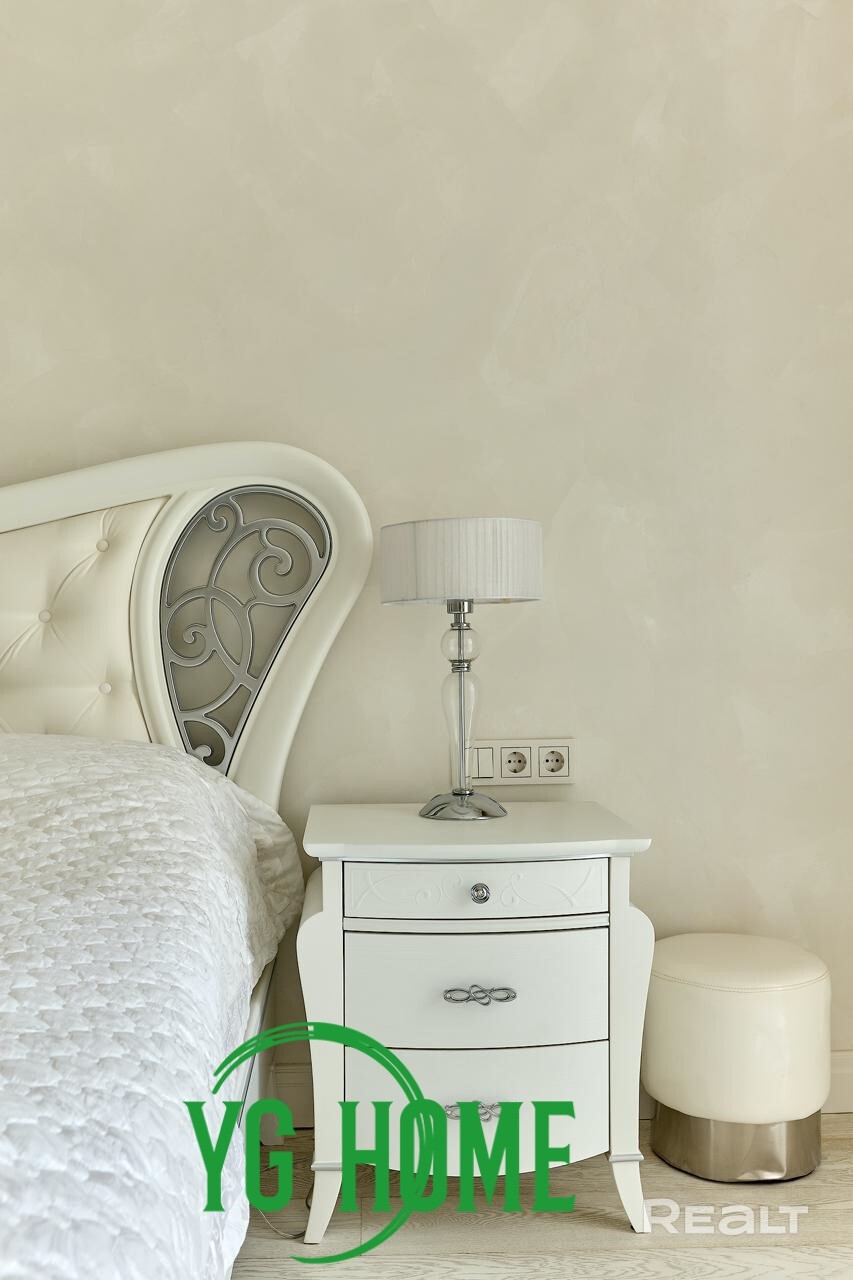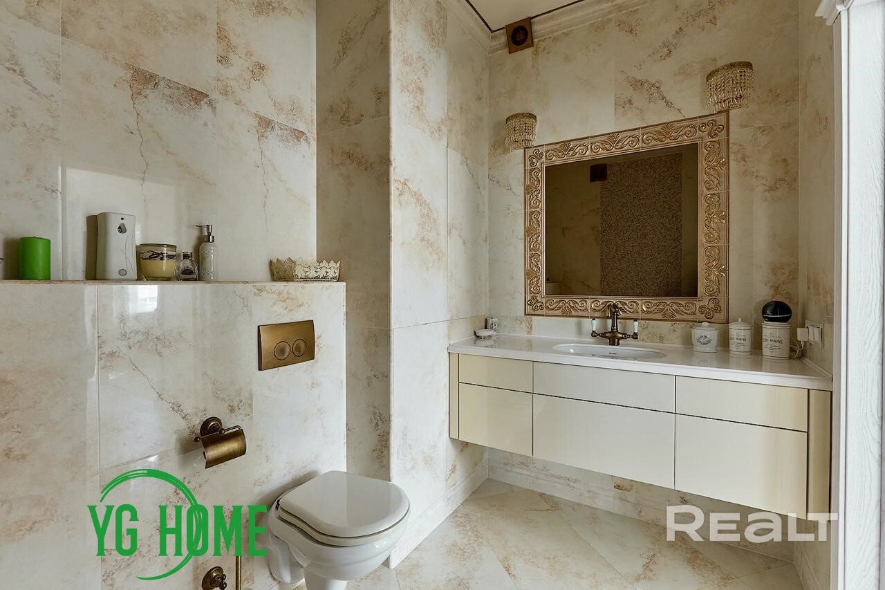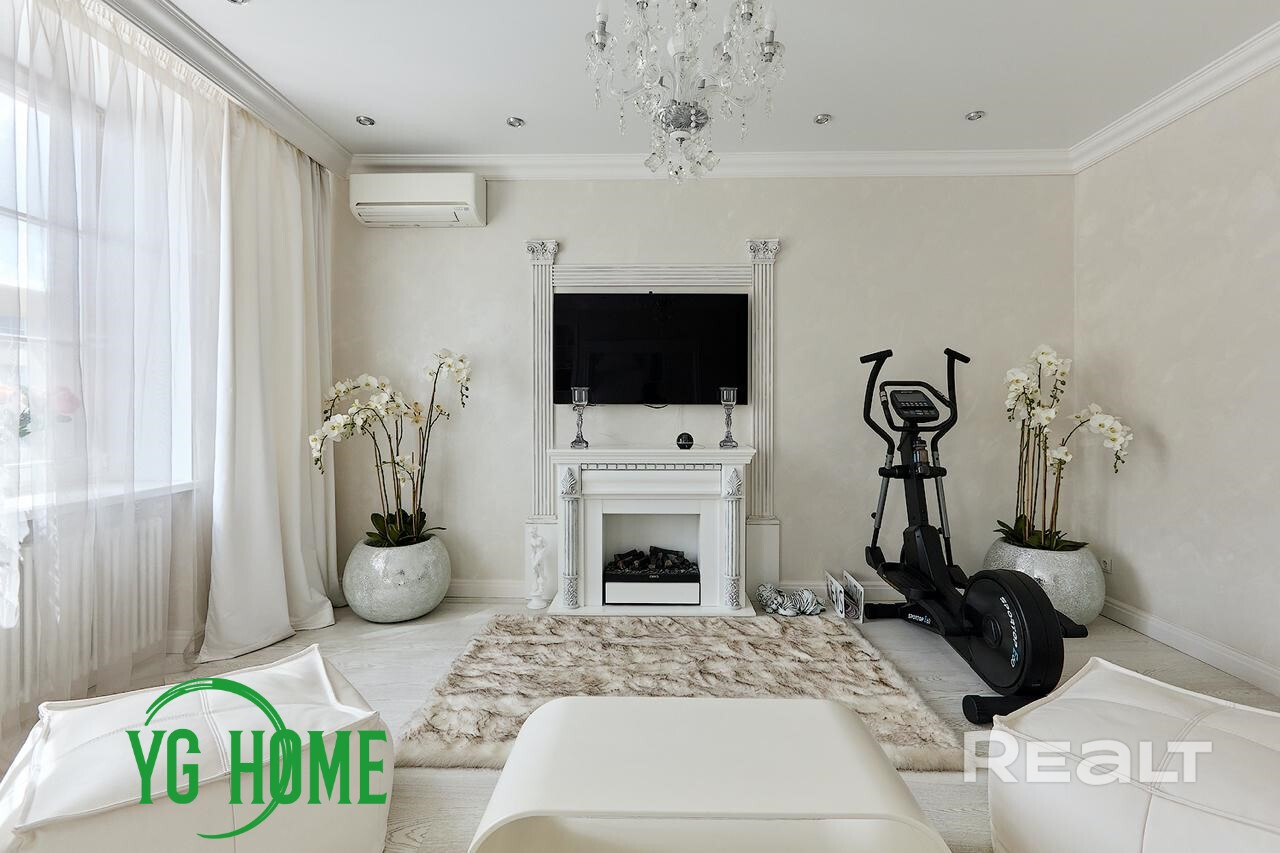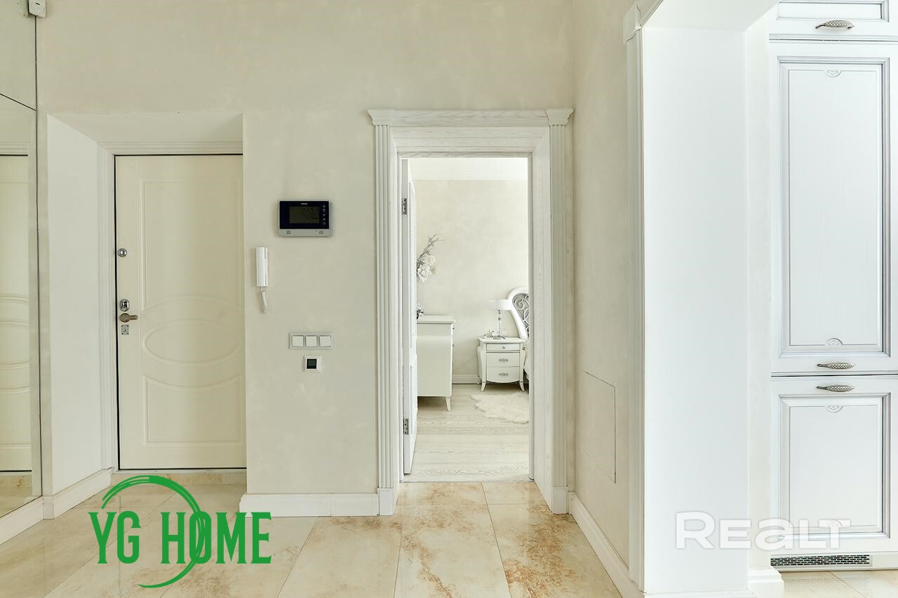 В интерьере использовались качественные импортные материалы: паркет из дуба GARBELOTTO  (Италия), плитка IMOLA (Италия), немецкая премиальная сантехника, вся мебель изготовлена под заказ из Европы (диван-реклайнер из натуральной кожи высочайшего качества Cattelan Italia), мебель из массива дуба, отделка золотом в ванной комнате (зеркало и мазаика), кристаллы Swarovski. На стенах венецианская штукатурка (Италия). Электрокамин с увлажнителем воздуха. Подогрев пола, кондиционеры, видеонаблюдение.