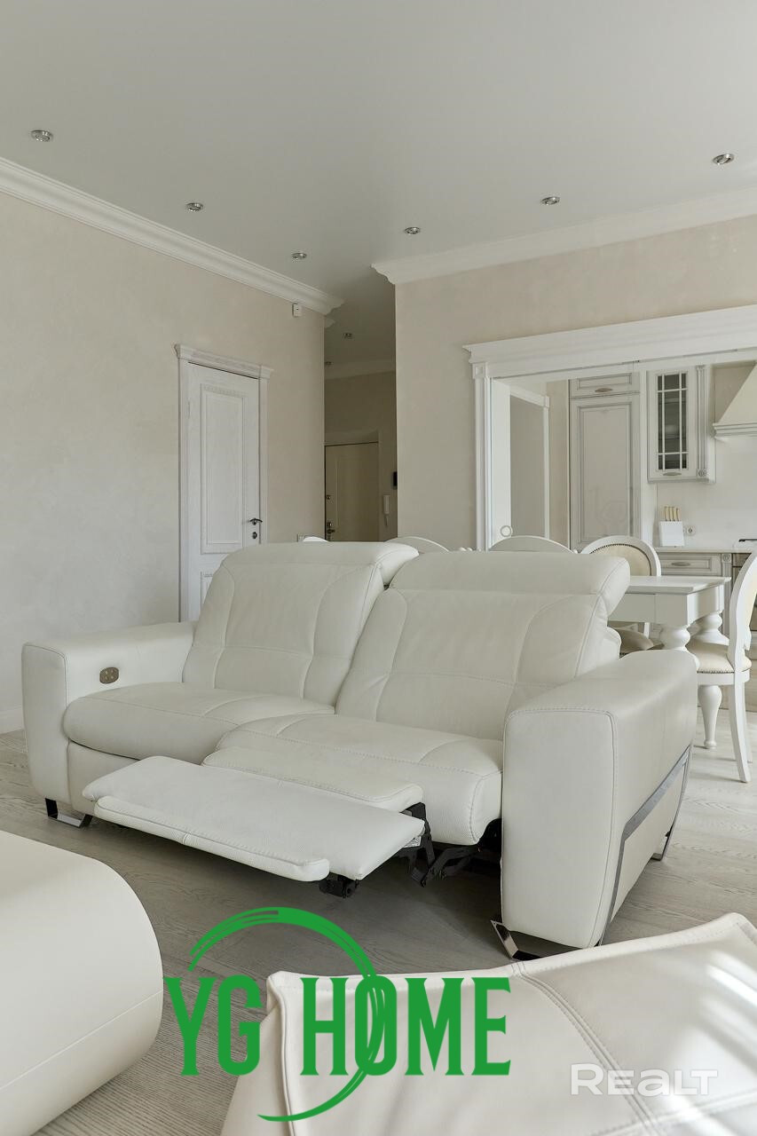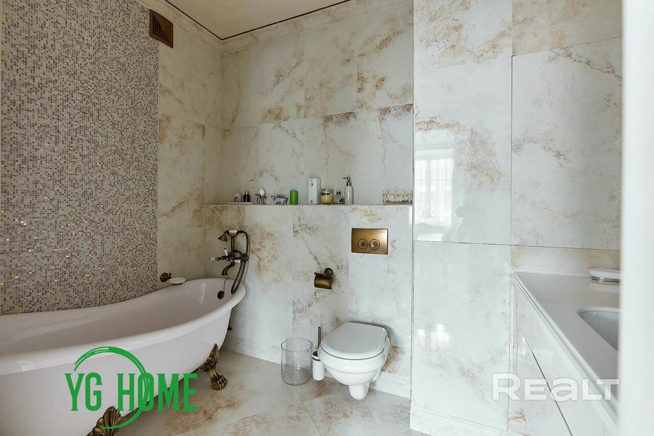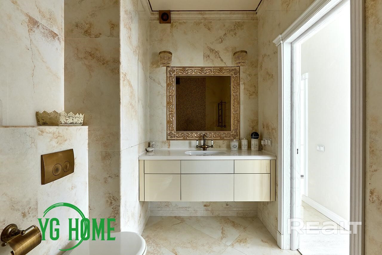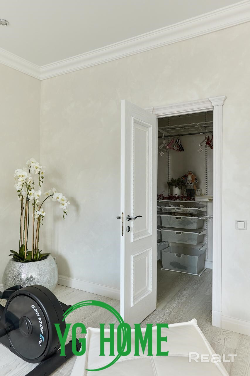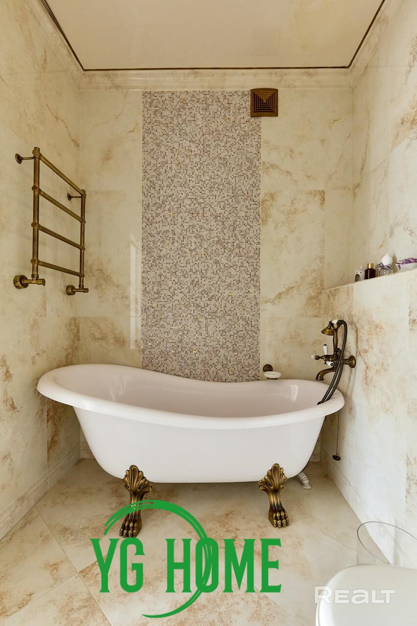 В интерьере использовались качественные импортные материалы: паркет из дуба GARBELOTTO  (Италия), плитка IMOLA (Италия), немецкая премиальная сантехника, вся мебель изготовлена под заказ из Европы (диван-реклайнер из натуральной кожи высочайшего качества Cattelan Italia), мебель из массива дуба, отделка золотом в ванной комнате (зеркало и мазаика), кристаллы Swarovski. На стенах венецианская штукатурка (Италия). Электрокамин с увлажнителем воздуха. Подогрев пола, кондиционеры, видеонаблюдение.
