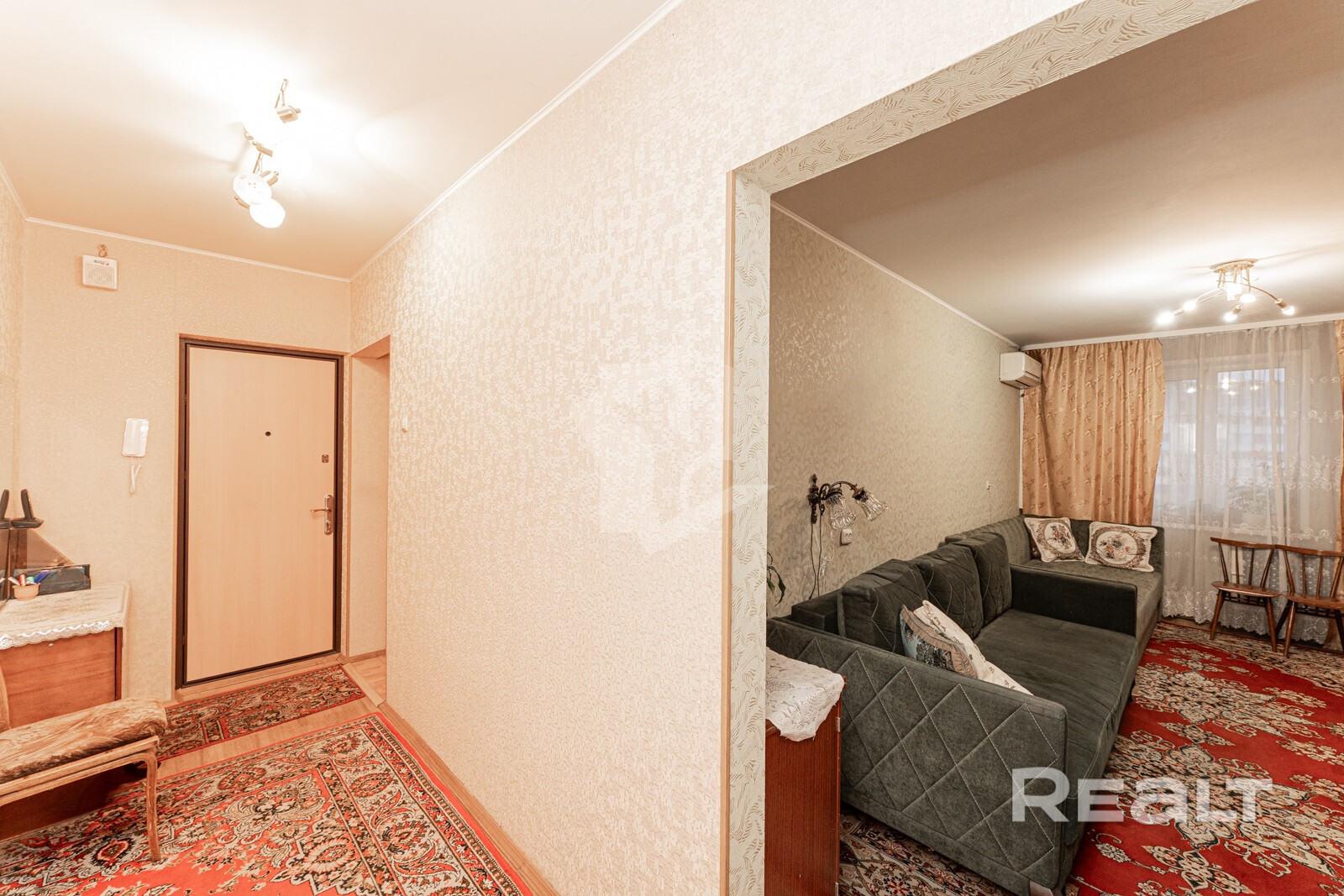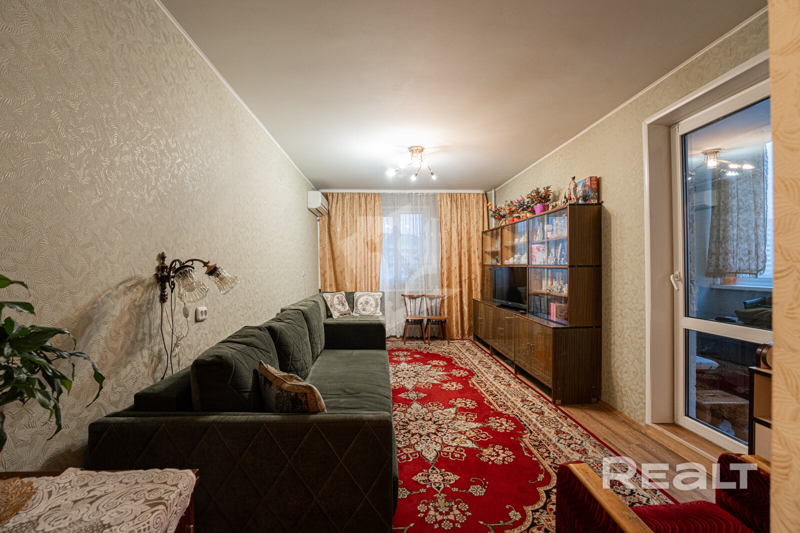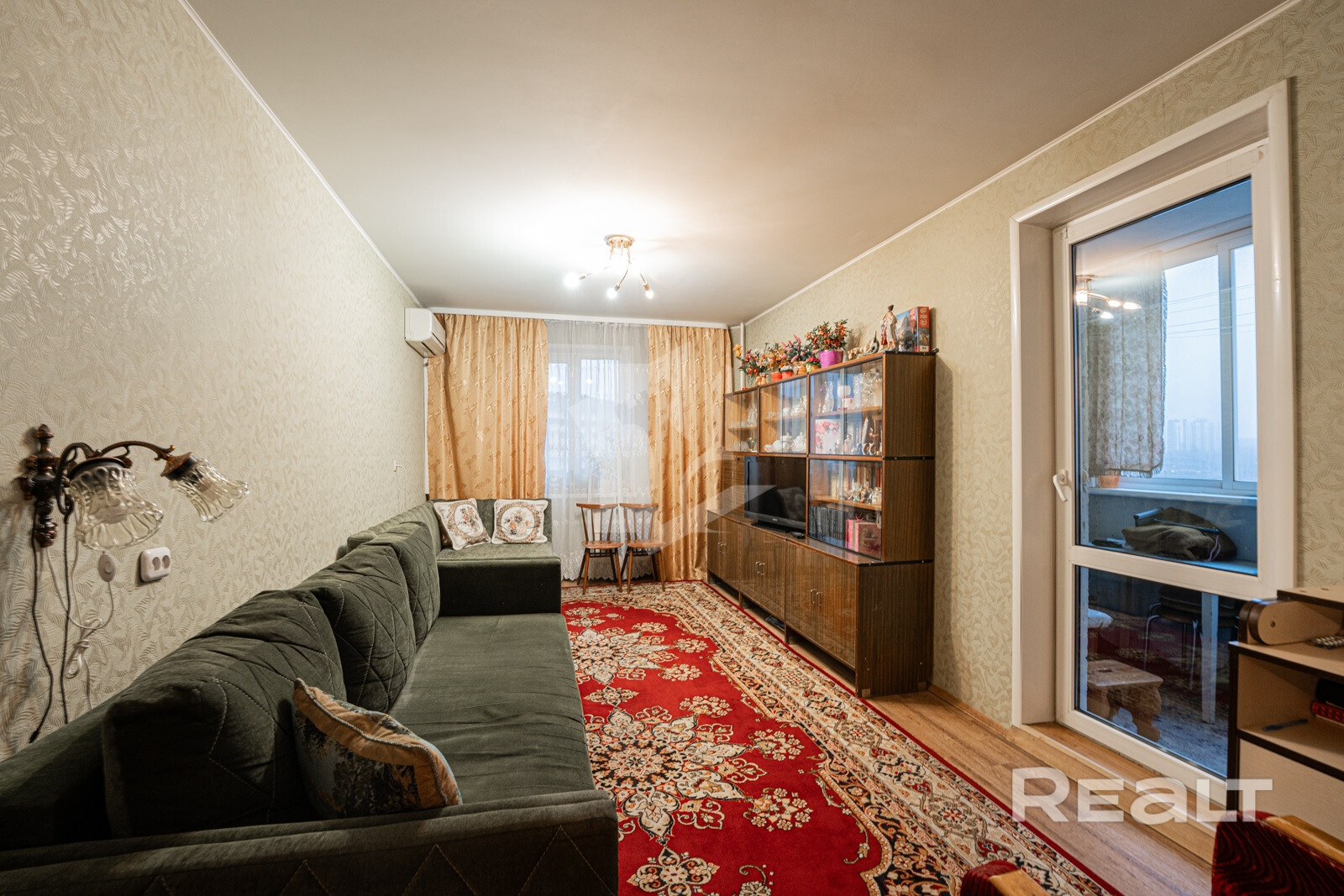 В комнате есть кондиционер, позволяющий комфортно сохранять приятную температуру в любое время года.