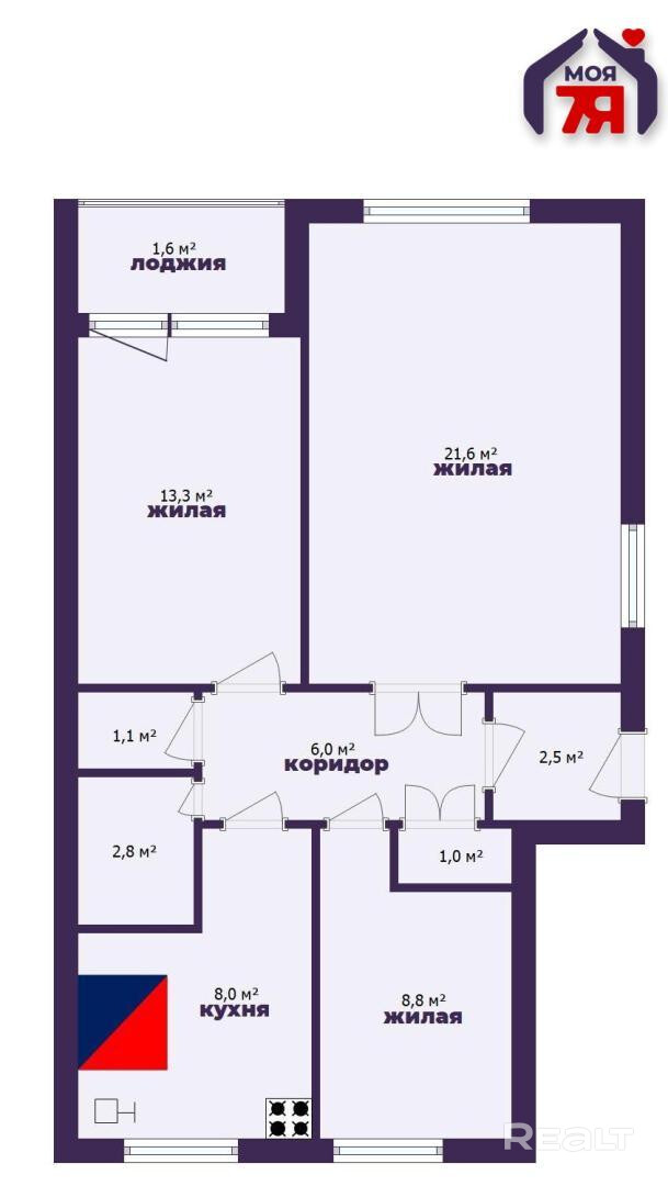 -На просторной кухне, площадью 8 кв.м. уже установлен практичный и функциональный кухонный гарнитур.