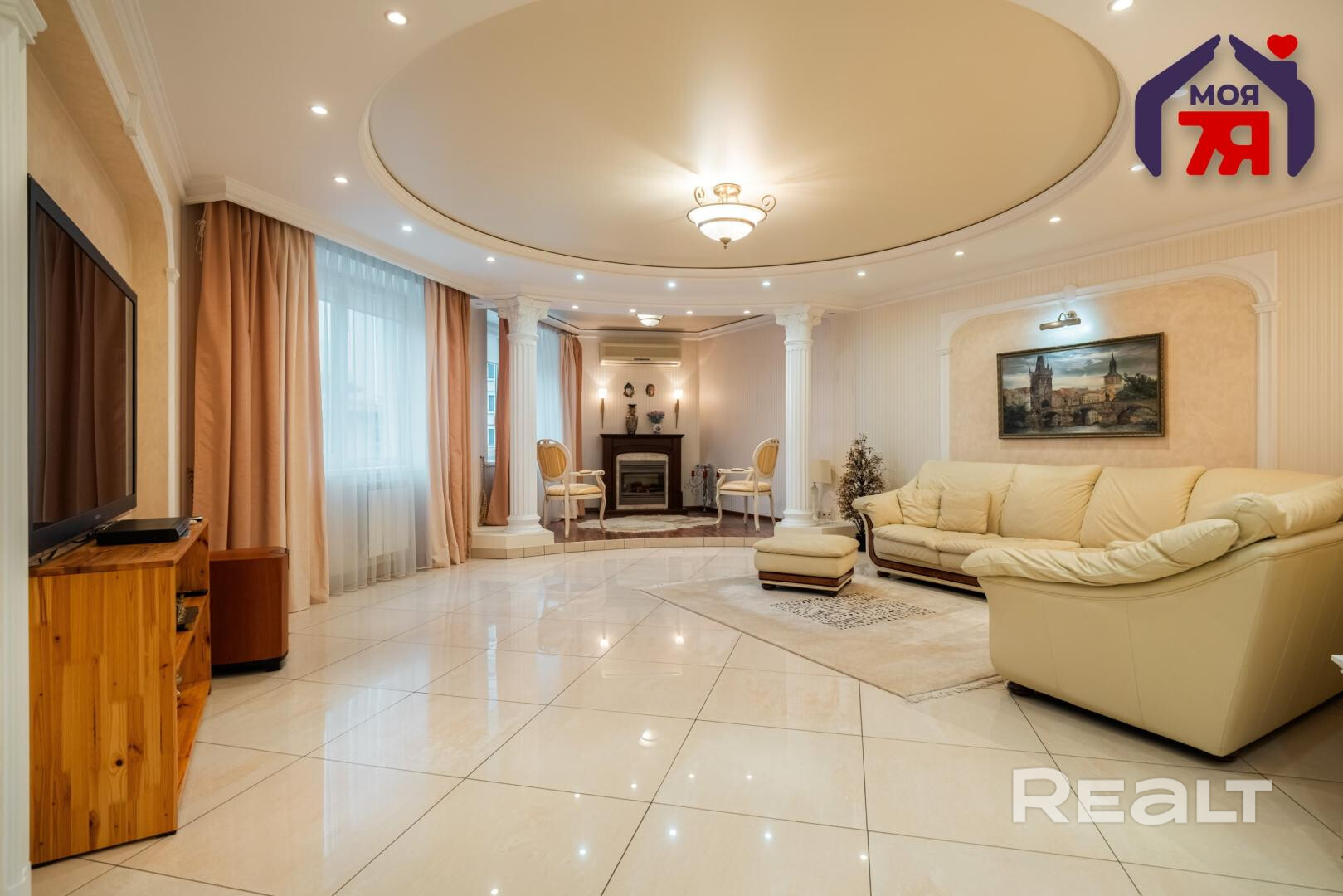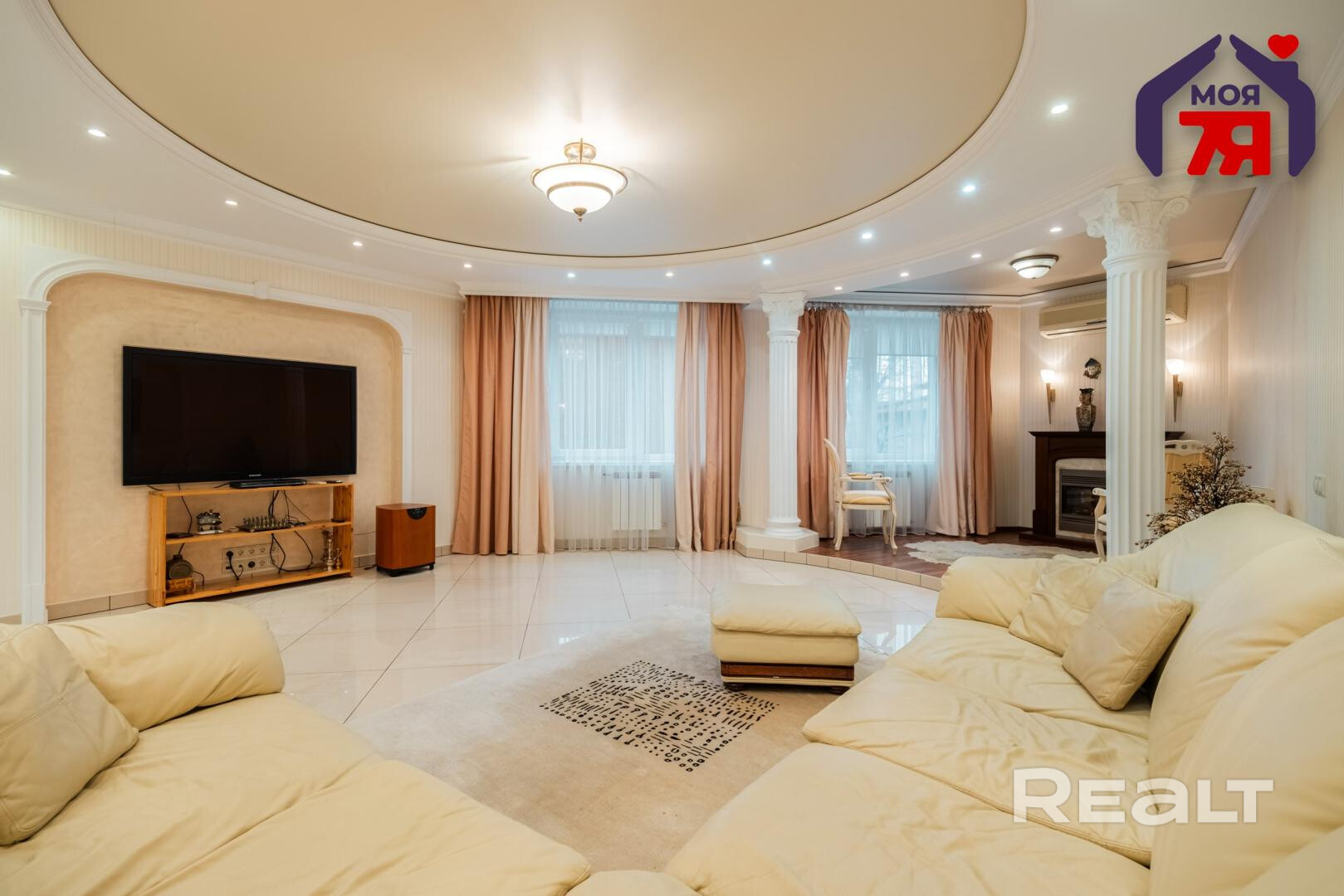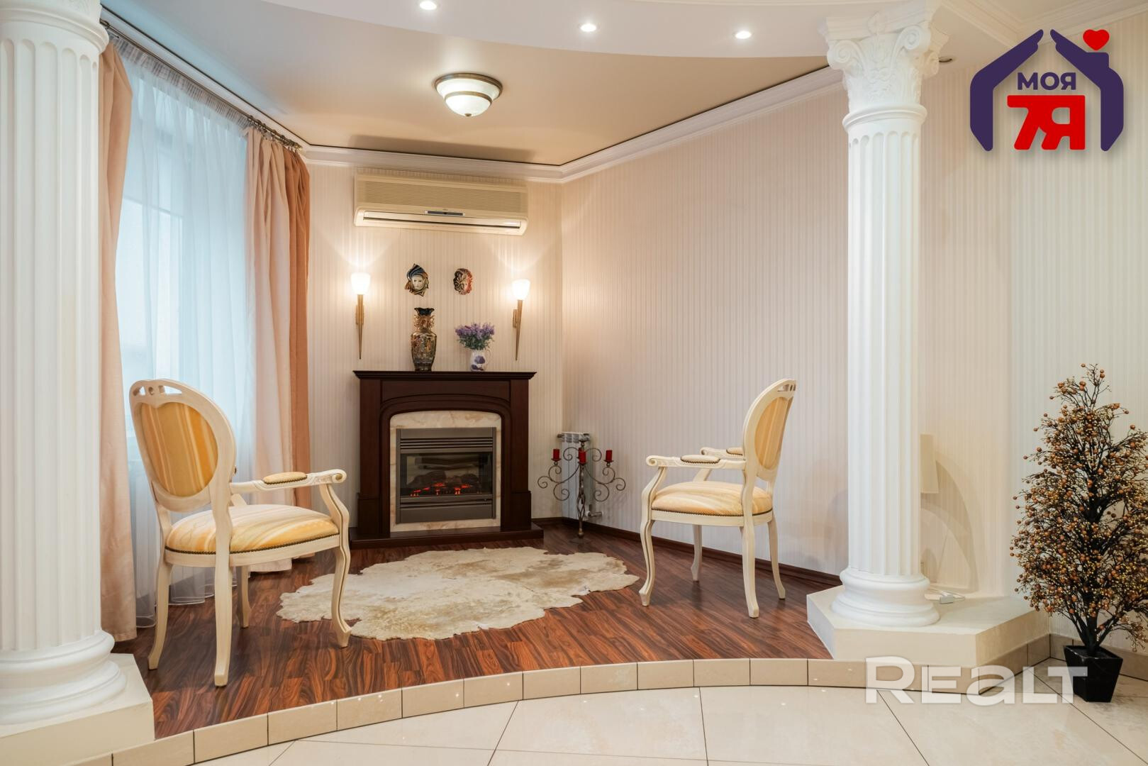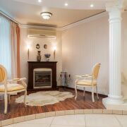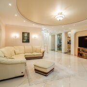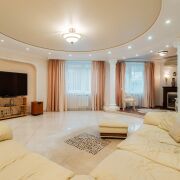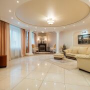 - Гостиная впечатляет простором и изысканным интерьером. Круглая потолочная композиция с подсветкой, колонны и декоративный камин подчёркивают архитектурную эстетику пространства. Большие окна наполняют комнату мягким светом, а удобная зона отдыха гармонично завершает интерьер.