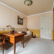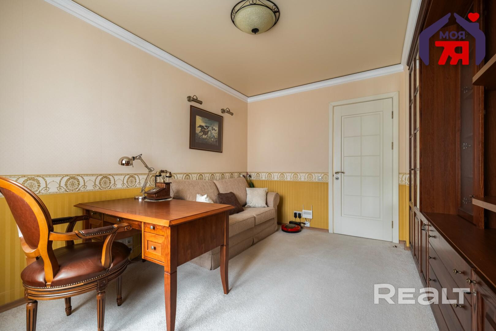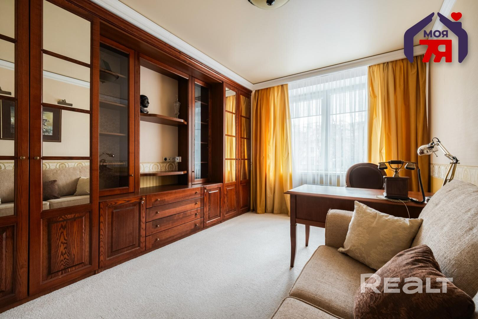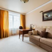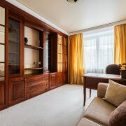 - Кабинет с встроенной мебелью во всю стену и рабочим столом. Большое окно обеспечивает естественное освещение для продуктивной работы.