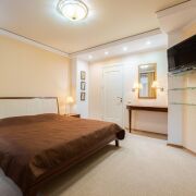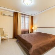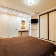 - Спальня включает кровать, прикроватные тумбы и большой шкаф. Кондиционер устанавливает комфортную температуру. Ковролин даёт мягкое покрытие по всей площади.