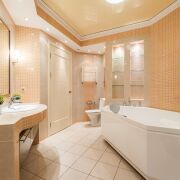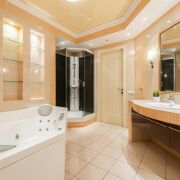 - Санузел совмещенного формата оснащён джакузи и душевой кабиной. Плиточная отделка и подсветка создают аккуратный визуальный облик. Установленное оборудование позволяет сразу пользоваться всем функционалом.