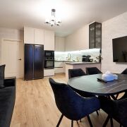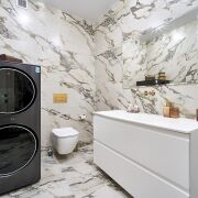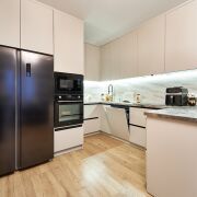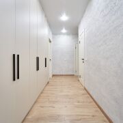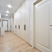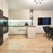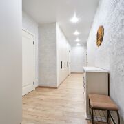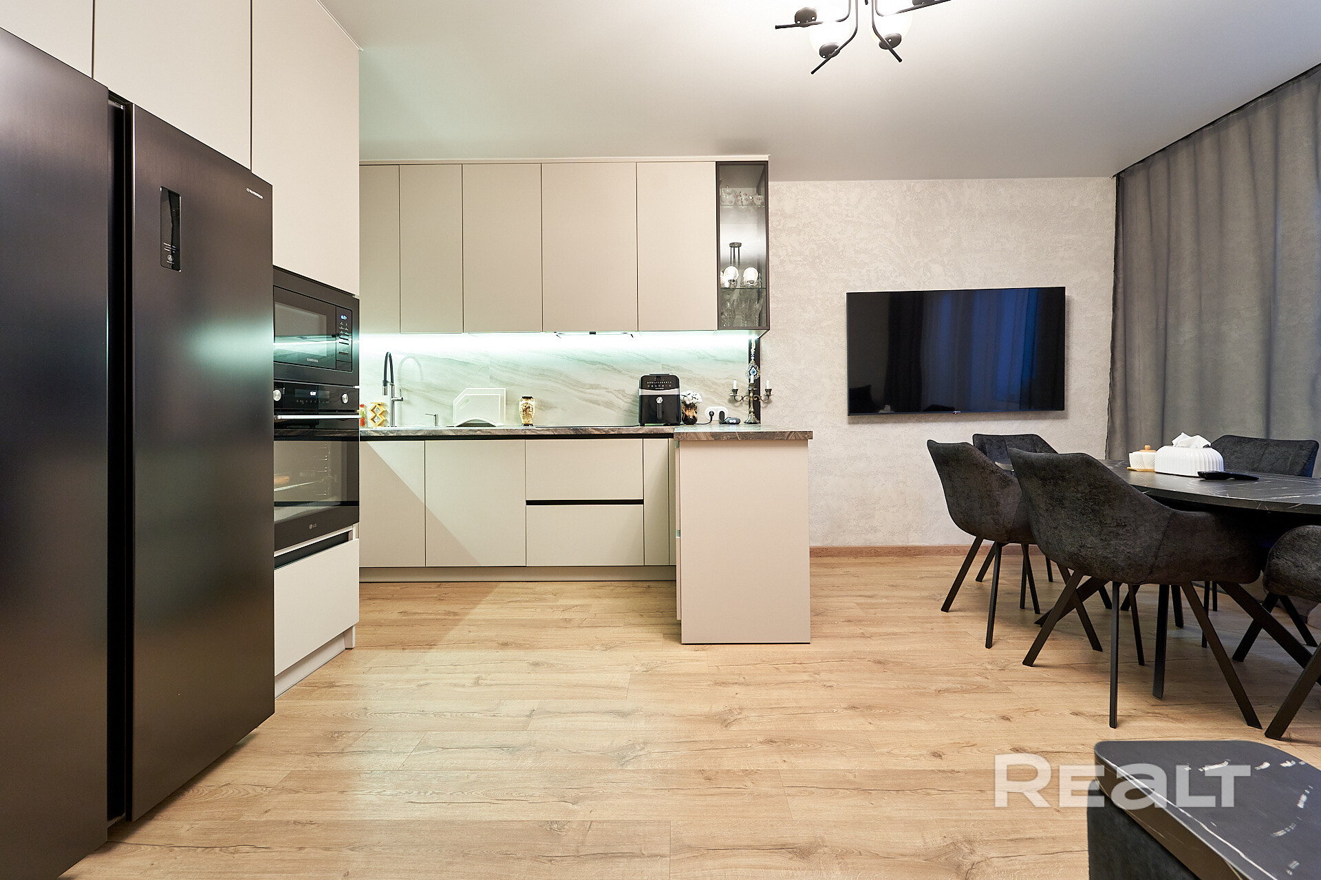 на полу ламинат высокого класса, угловая встроенная кухня с качественной бытовой техникой,посудомоечная машина, все продумано до мелочей!! В 2 санузлах испанская плитка,стиральная и сушильная машины, бойлер на 3 стояка. Межкомнатные двери-массив. Встроенные шкафы в коридоре. Удобные места для хранения.