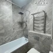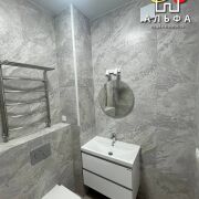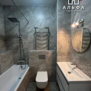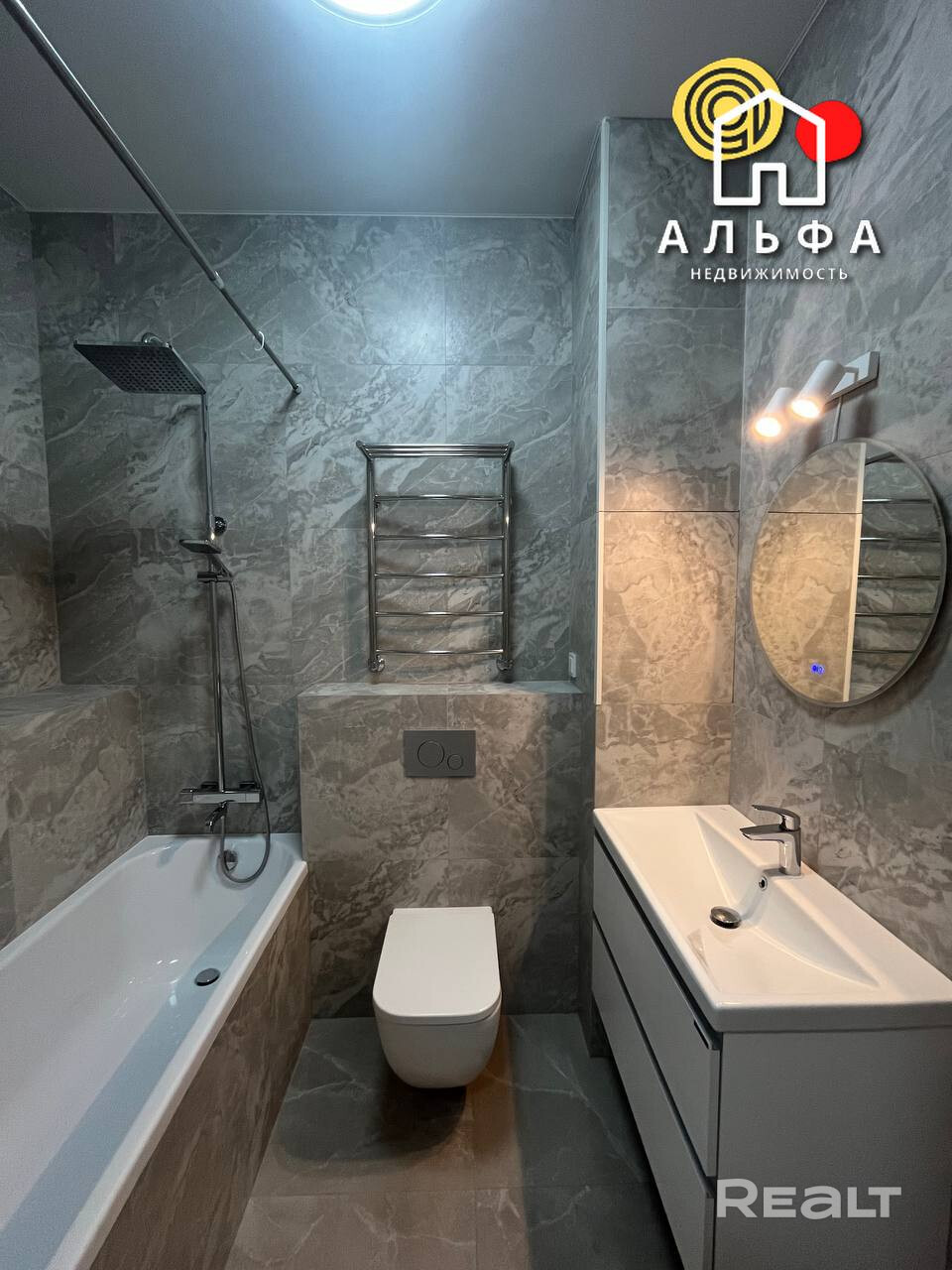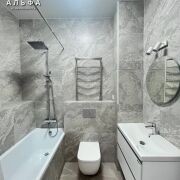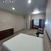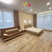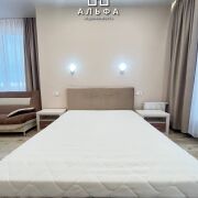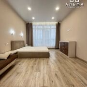 Спальня выполнена в спокойных тонах. Укомплектована кроватью с удобным матрасом, вместительным шкафом-купе и прикроватными тумбочками, диваном, комодом. Два панорамных окна обеспечивают максимальное естественное освещение и возможность наслаждаться видами из вашей спальни. Также есть возможность выделить еще одну комнату, что добавляет гибкости в использовании пространства. Санузел совмещенный. В нем поместилось всё, что необходимо: ванна, раковина, зеркало с подсветкой, большая и вместительная тумба, полотенцесушитель.