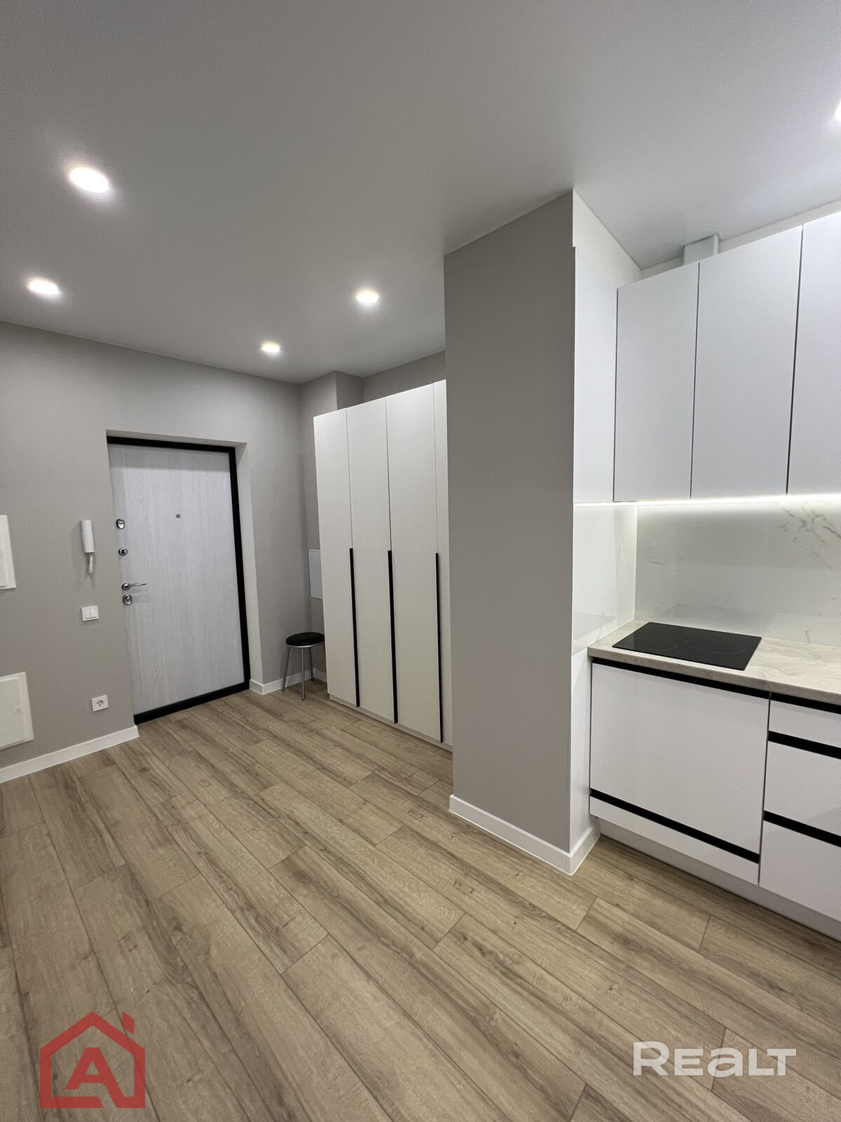• В кухне установлена встроенная мебель, духовой шкаф, варочная панель, вытяжка и посудомоечная машина.