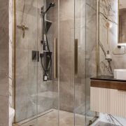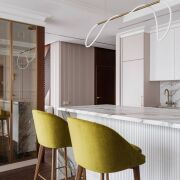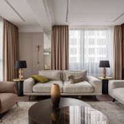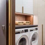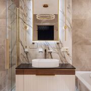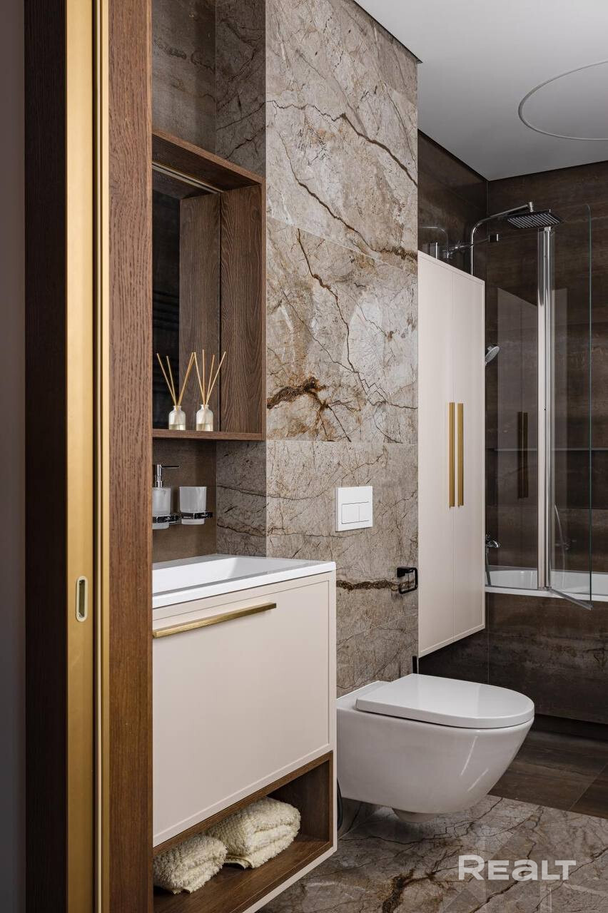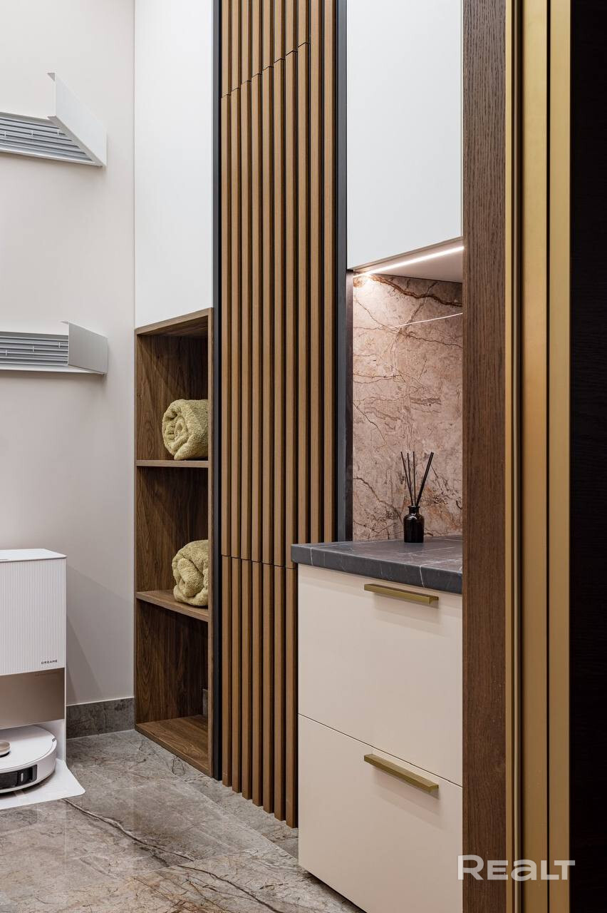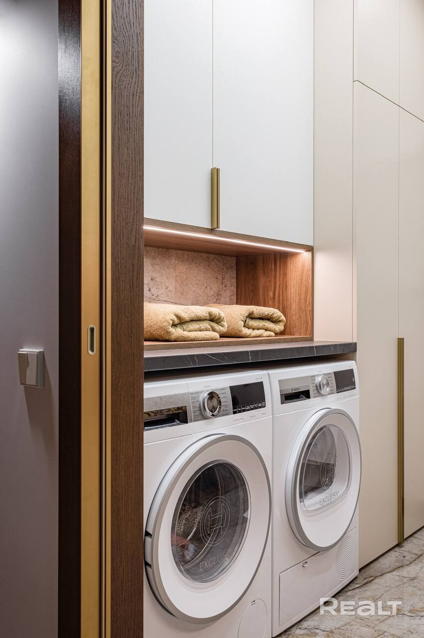 Кухня оснащена современной техникой от ведущих производителей: духовой шкаф, варочная панель и микроволновая печь Siemens, посудомоечная машина Bosch, холодильник и морозильная камера Liebherr. В ванных комнатах установлена сантехника Hansgrohe и Villeroy & Boch, а также керамогранит премиум-класса.
