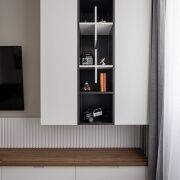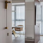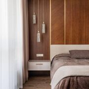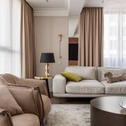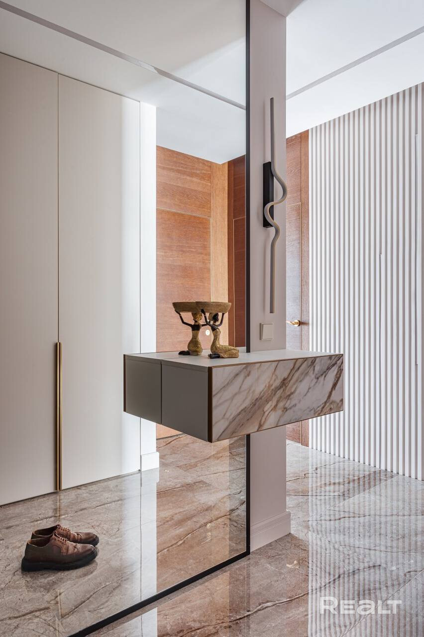 В отделке квартиры использованы только высококачественные материалы: паркетная доска и керамогранит на полу, шпонированные настенные панели и двери от "Лацио". Мебель выполнена под заказ по индивидуальному дизайн-проекту, а столешница и покрытие островка в кухне из стильного керамогранита.