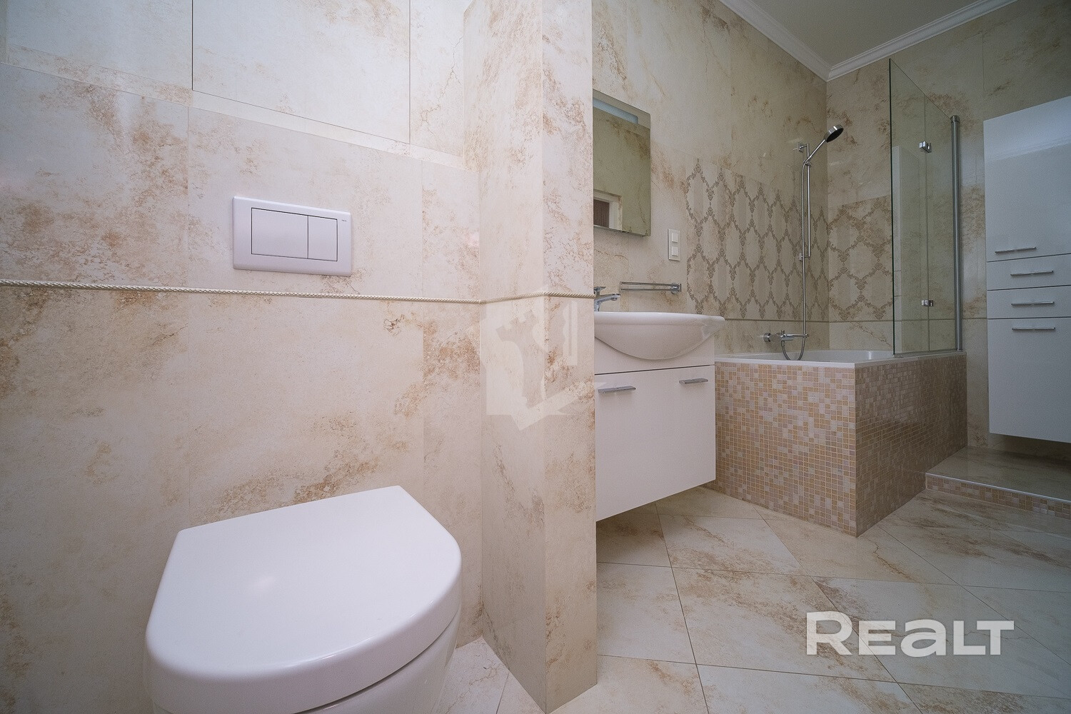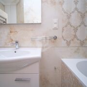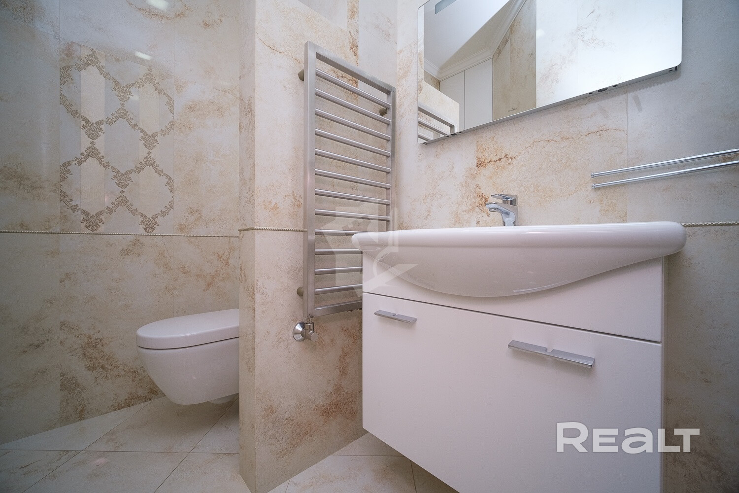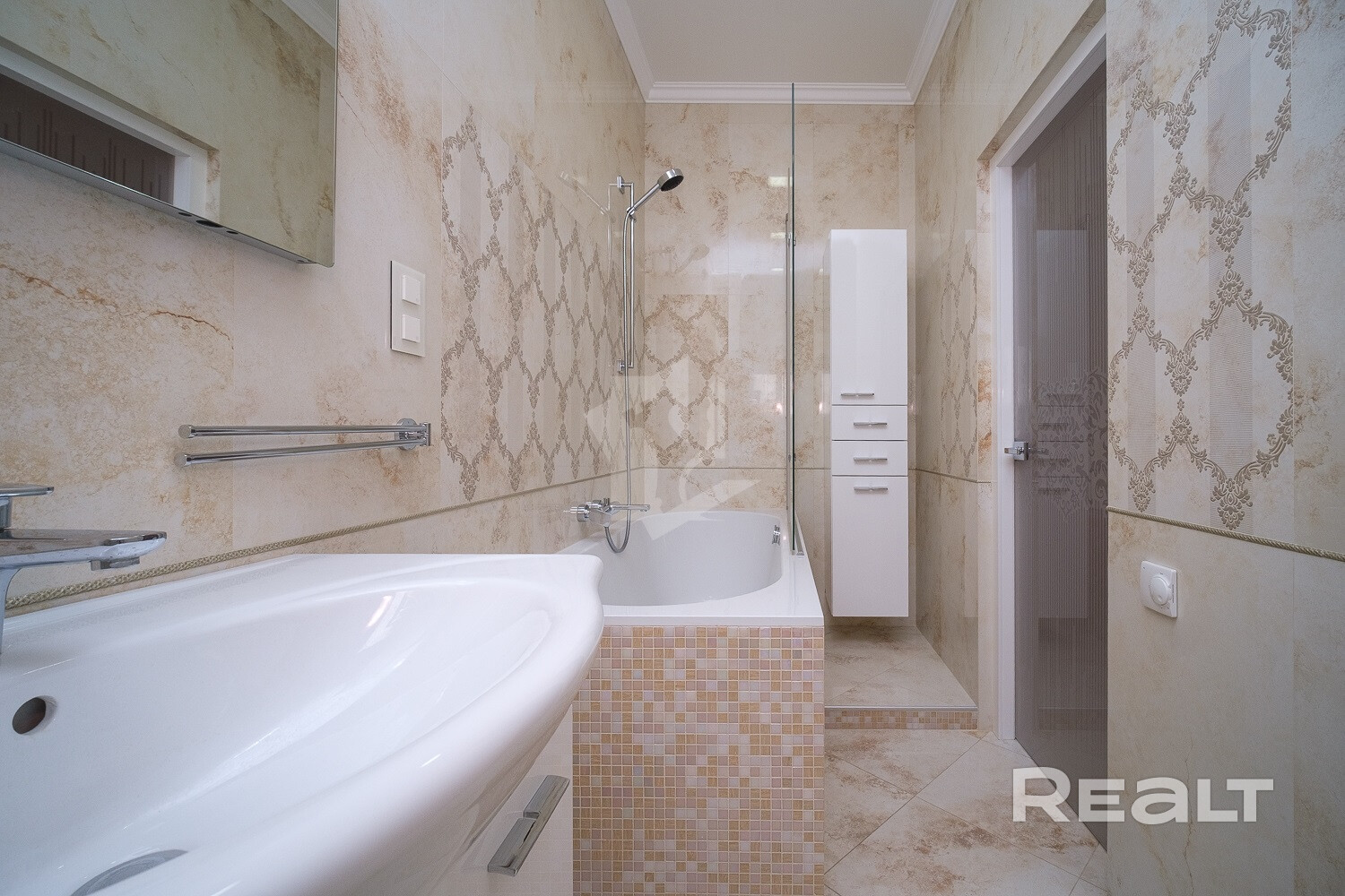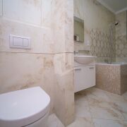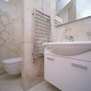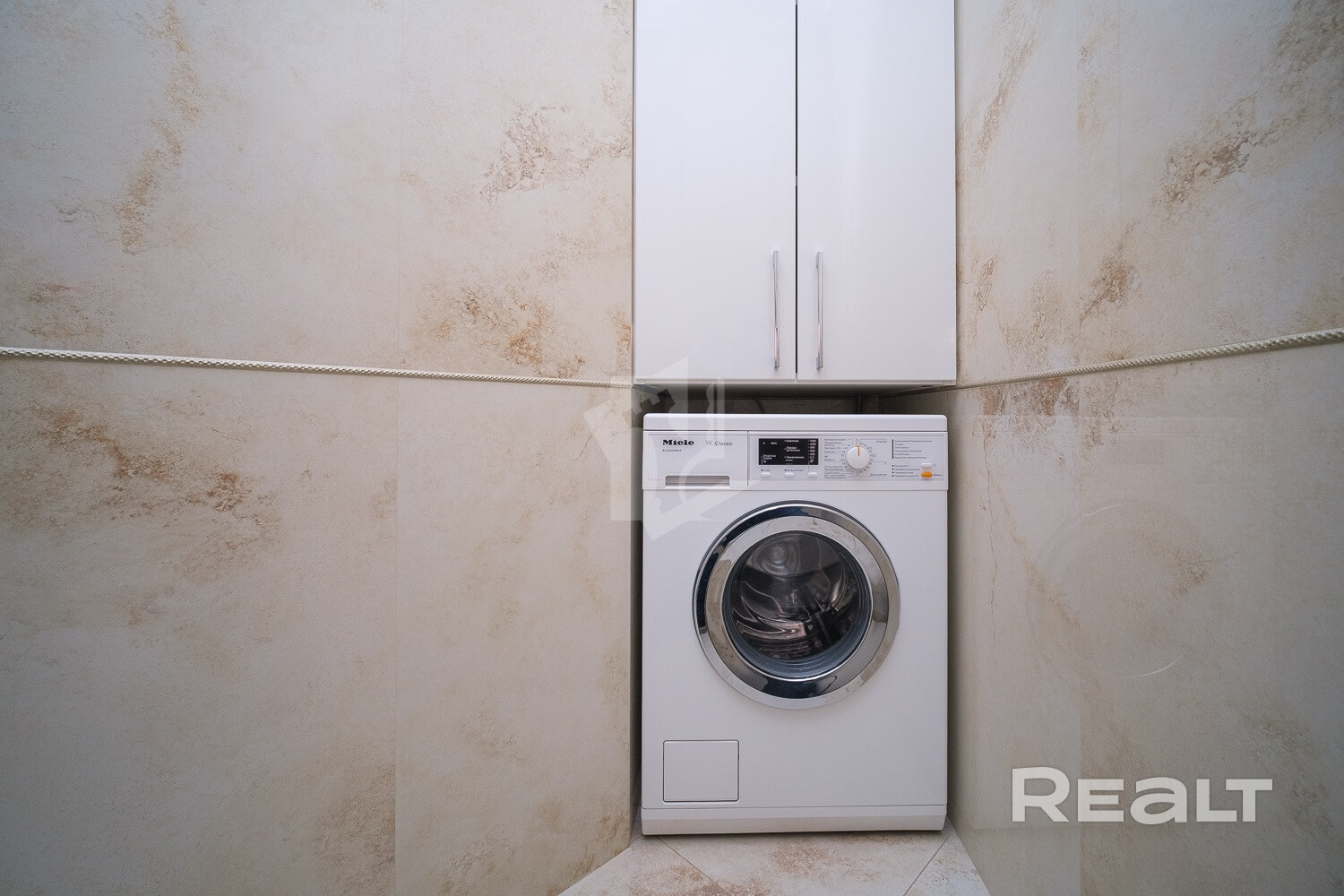 Мебель в ванной комнате и вся сантехника (класс white plus) – Villeroy&Boch (поставщик Сквирел). Стиральная машина – Miele.