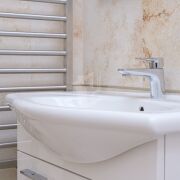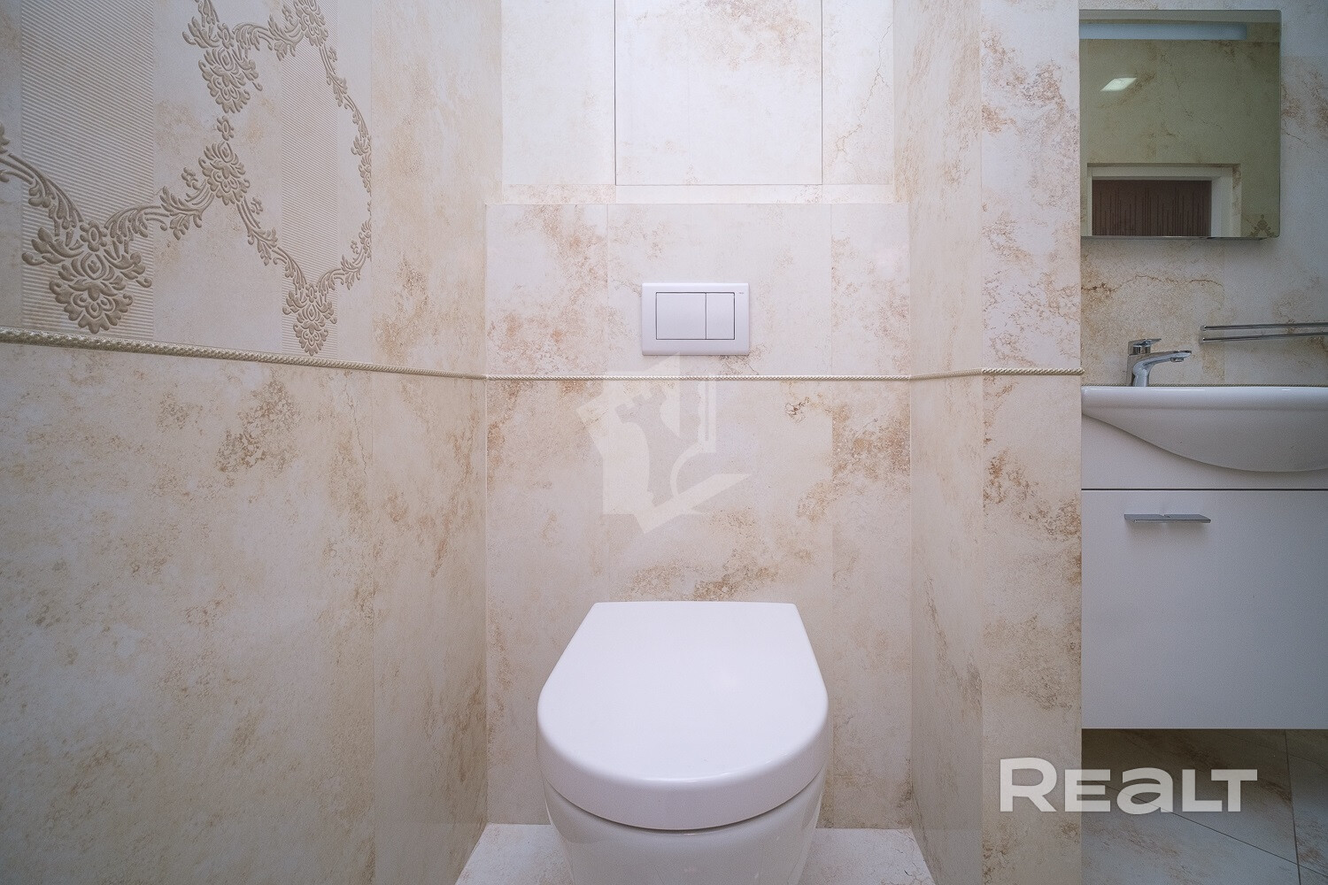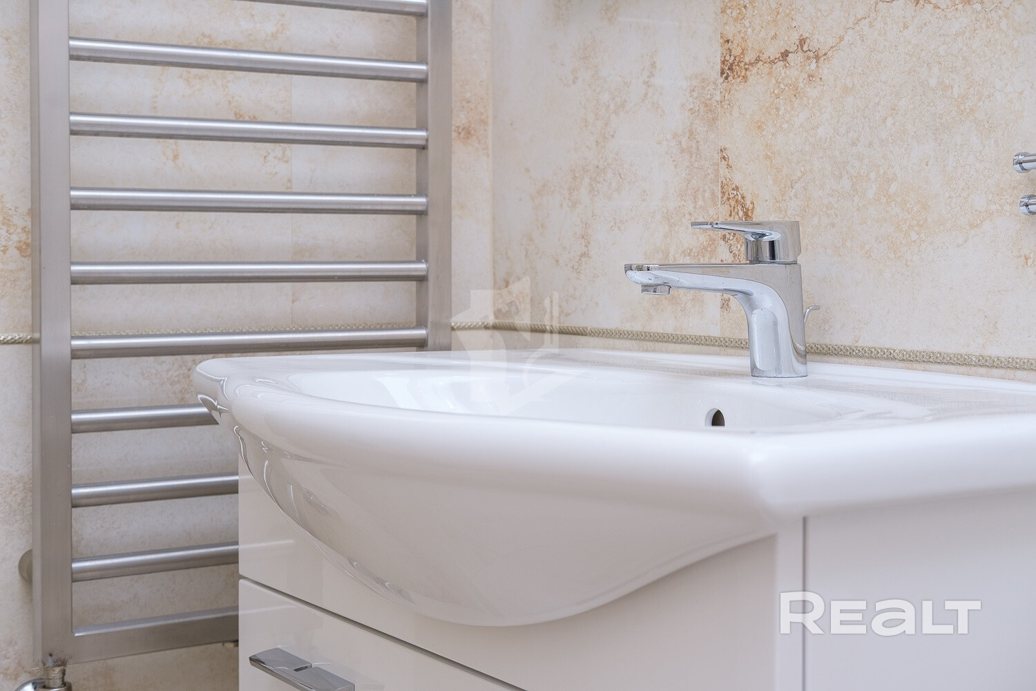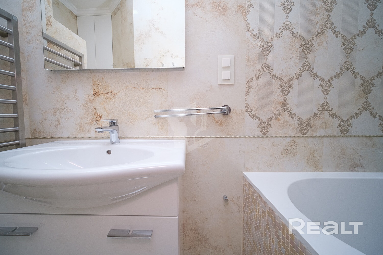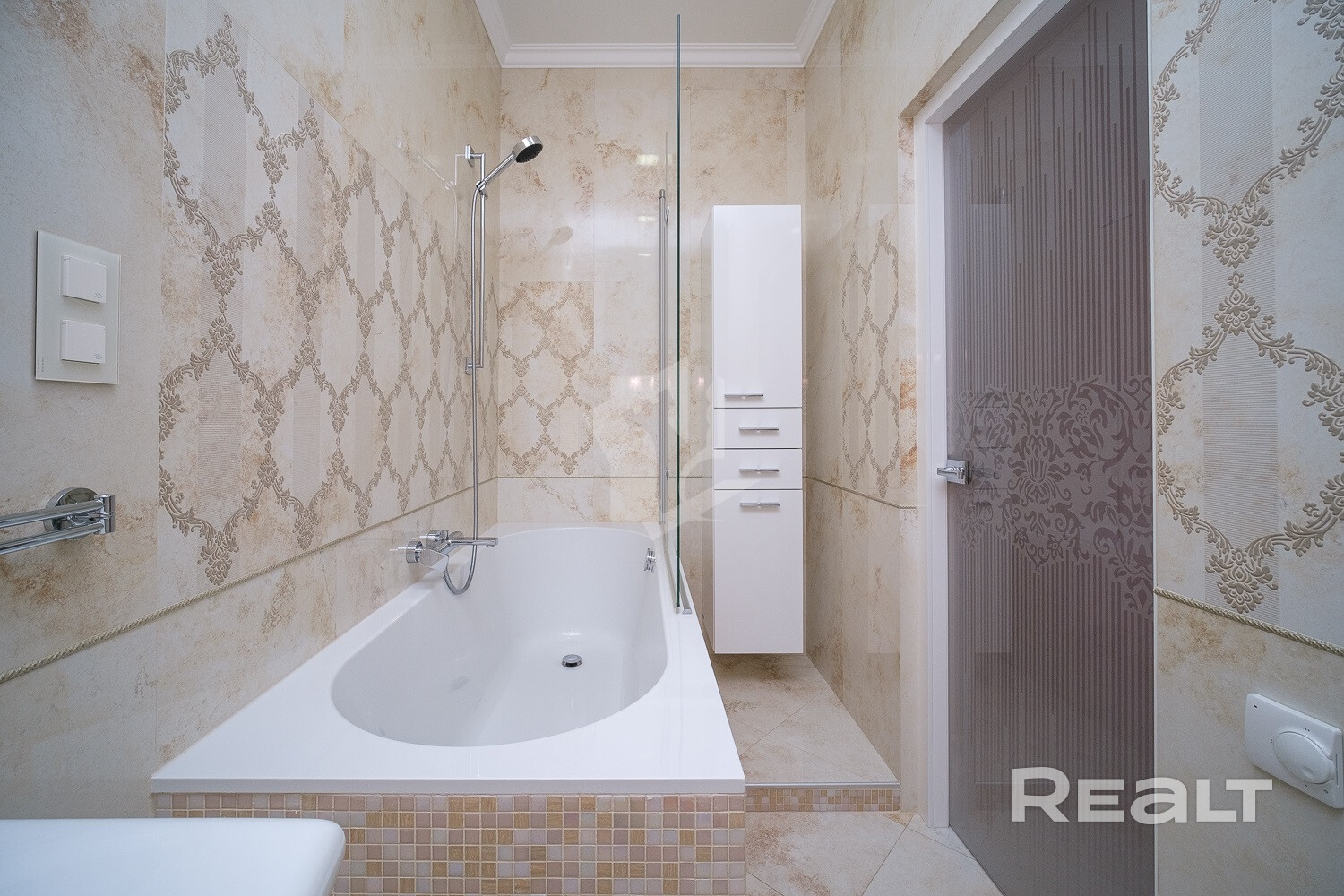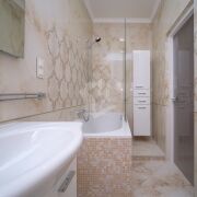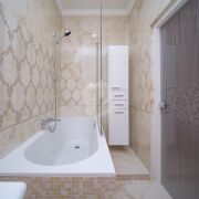 Мебель в ванной комнате и вся сантехника (класс white plus) – Villeroy&Boch (поставщик Сквирел). Стиральная машина – Miele.