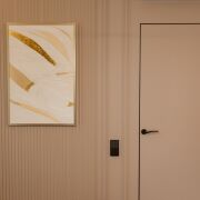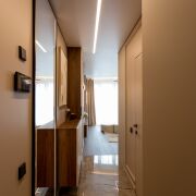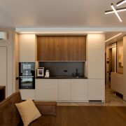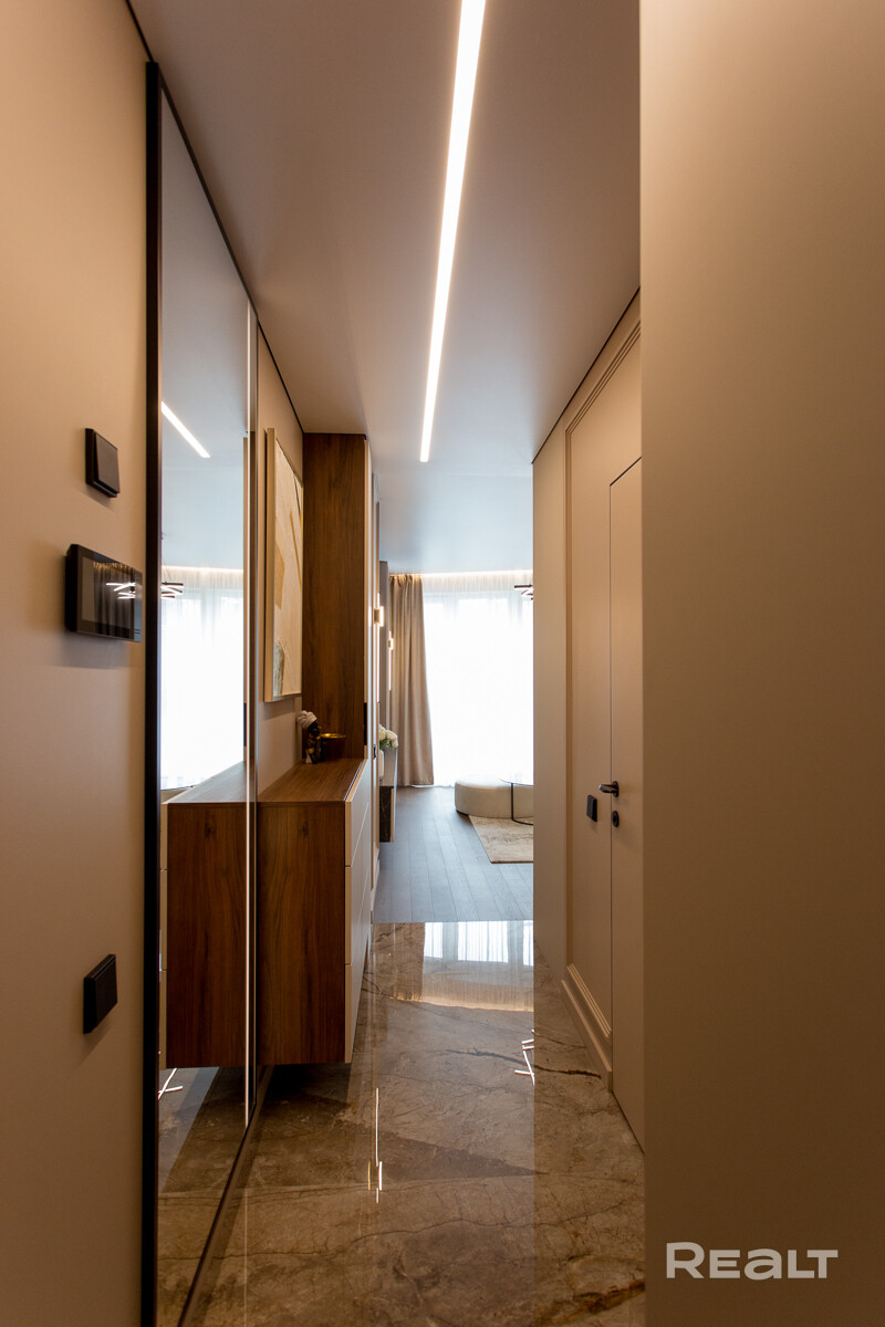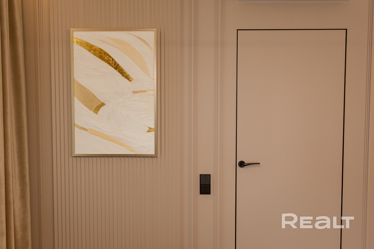 По СНБ площадь квартиры составляет 56.5 кв. м, а жилая площадь с кухонным оборудованием – 49.6 кв. м. На полу уложена паркетная доска Coswick и керамогранит. Все межкомнатные двери (Лацио). Вся мебель изготовлена под заказ по индивидуальному дизайн-проекту. Установлена надежная входная металлическая дверь усиленной конструкции, которая обеспечивает максимальную шумоизоляцию. Также имеется видеодомофон.
