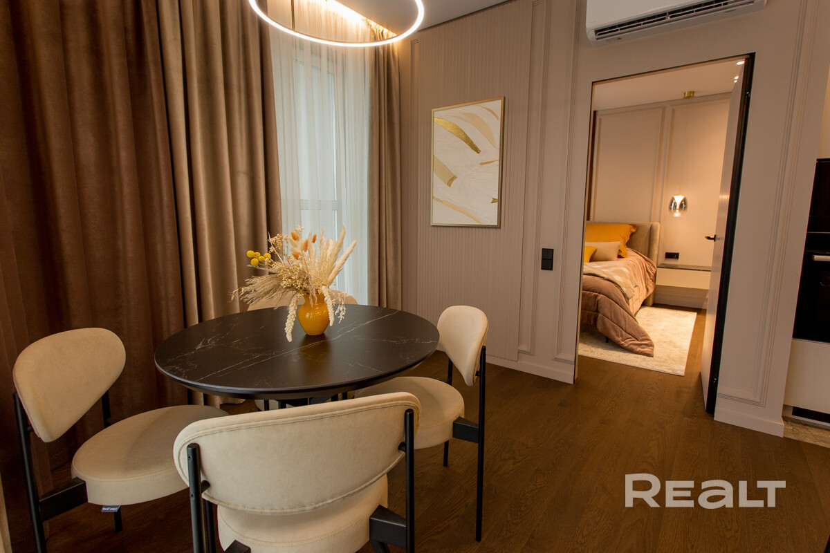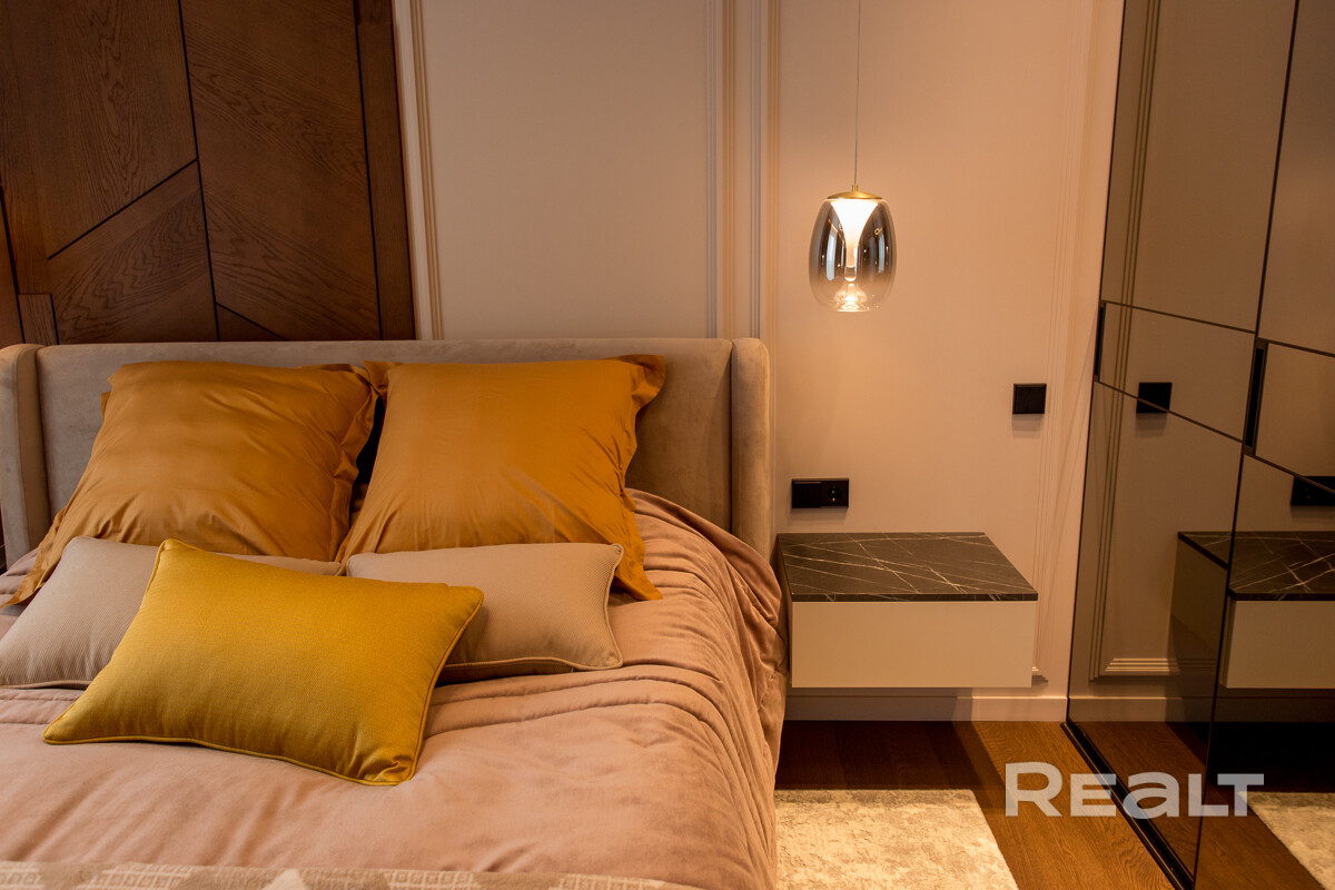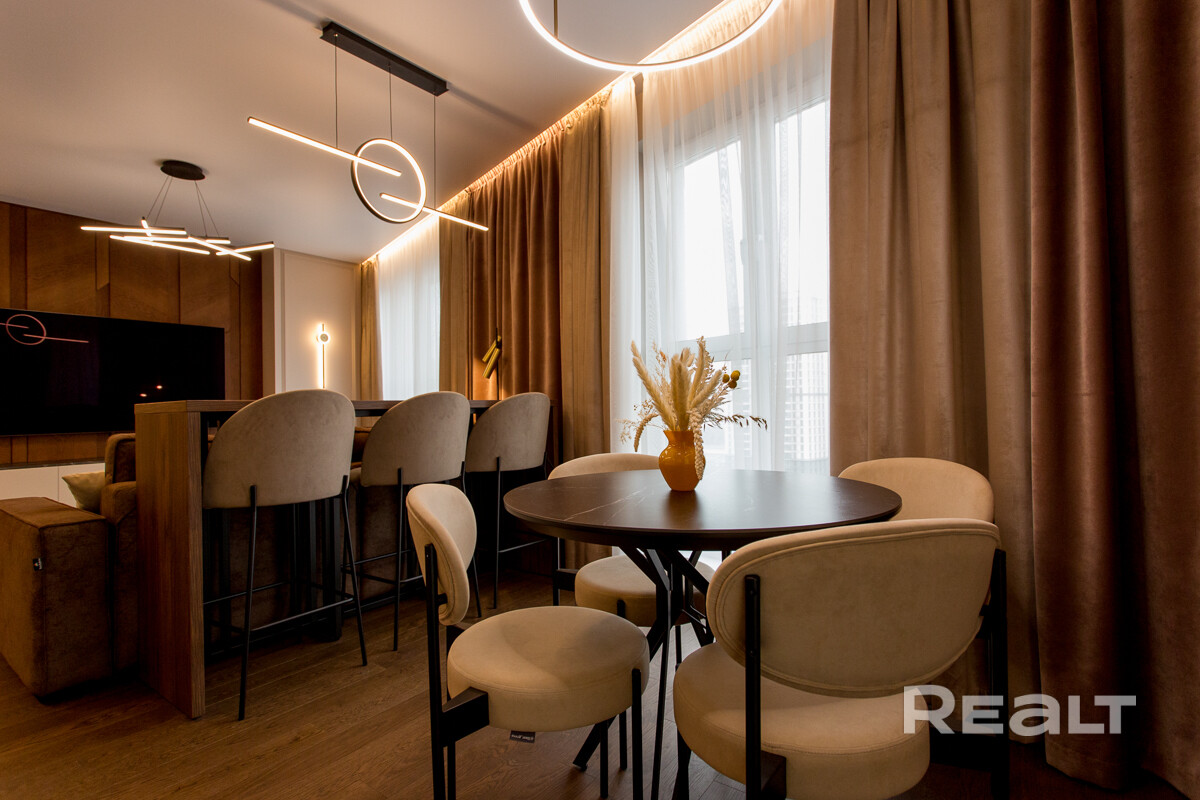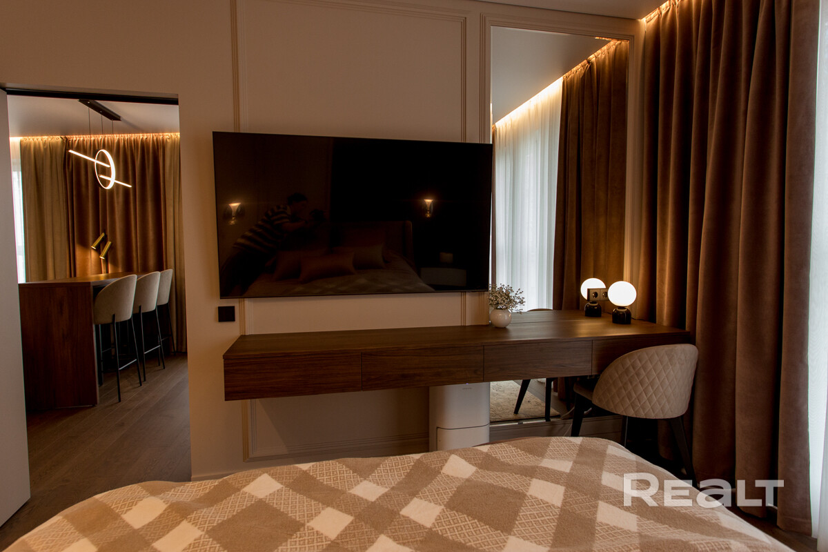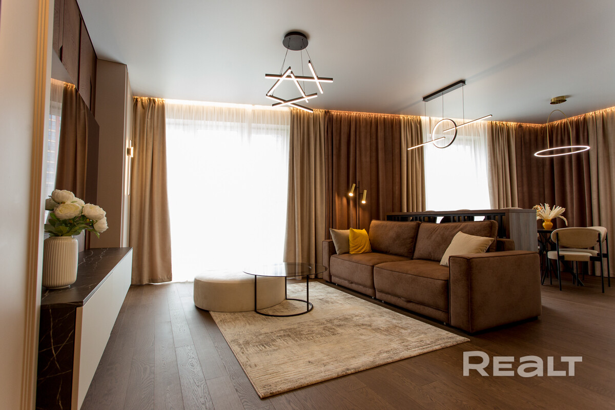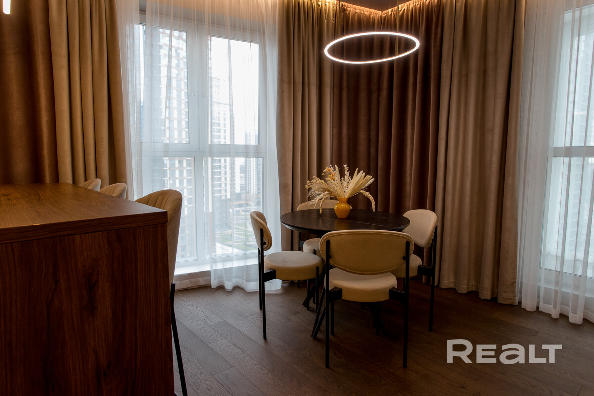 Квартира находится в престижном комплексе Minsk World, в непосредственной близости от Международного финансового центра, станции метро "Аэродромная" и торгово-развлекательного центра "Авиа Молл". Окна квартиры выходят на прекрасный вид, не упирающийся в соседние дома.