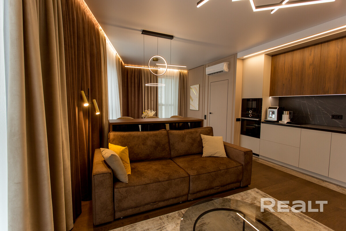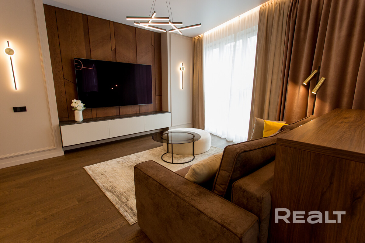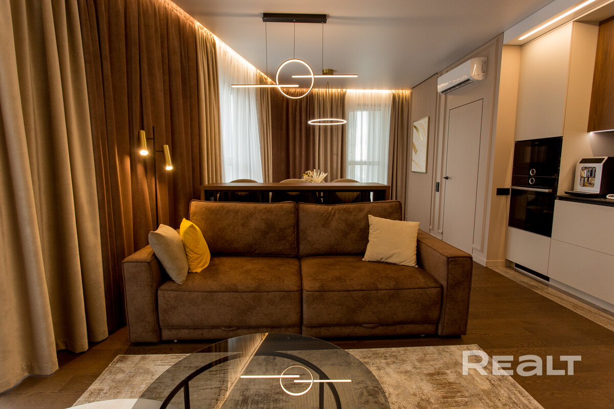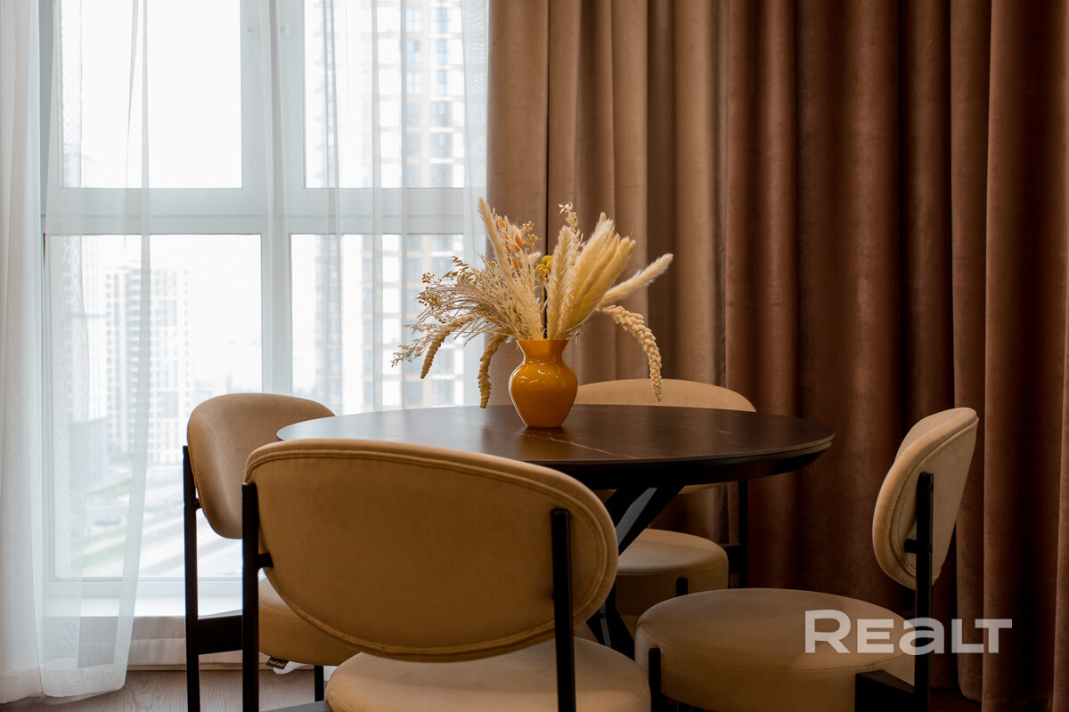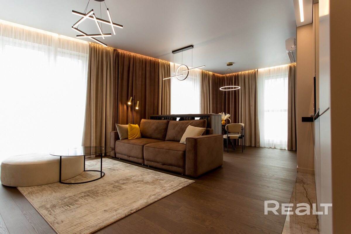 Квартира находится в престижном комплексе Minsk World, в непосредственной близости от Международного финансового центра, станции метро "Аэродромная" и торгово-развлекательного центра "Авиа Молл". Окна квартиры выходят на прекрасный вид, не упирающийся в соседние дома.