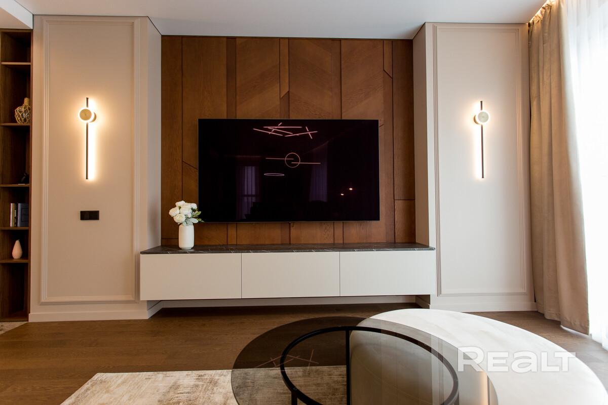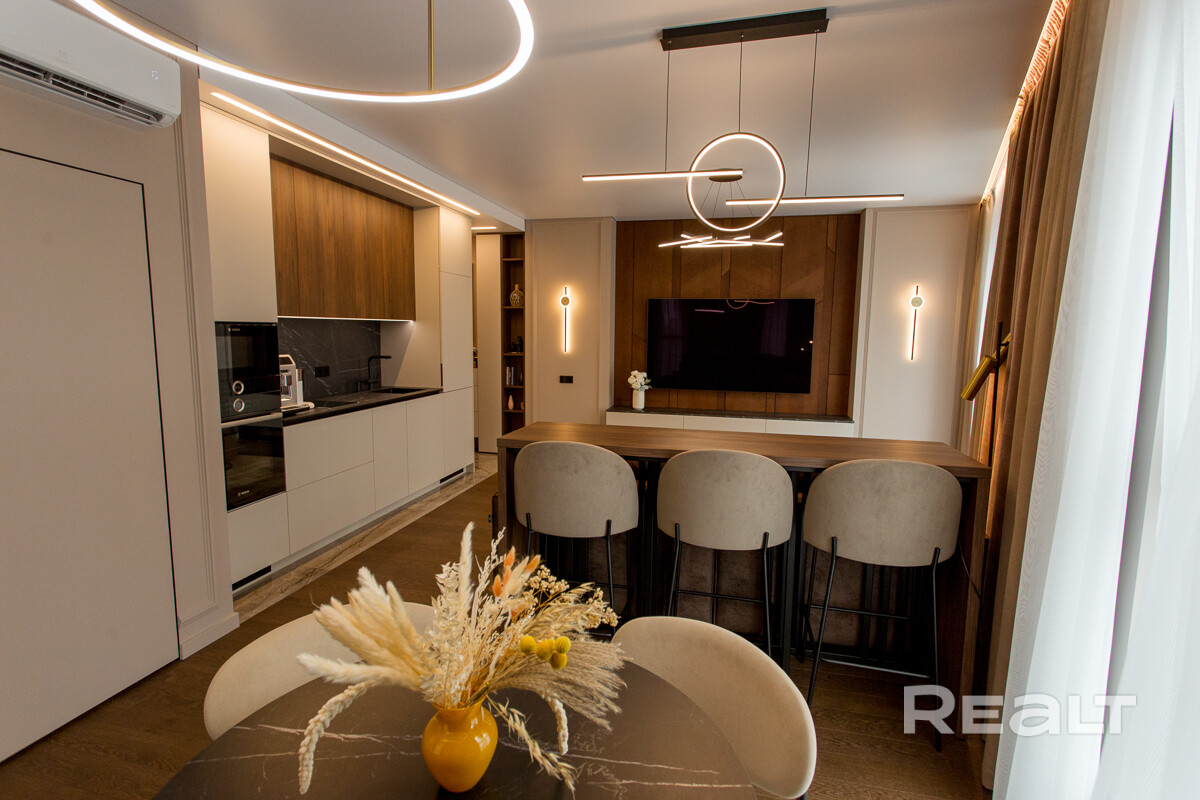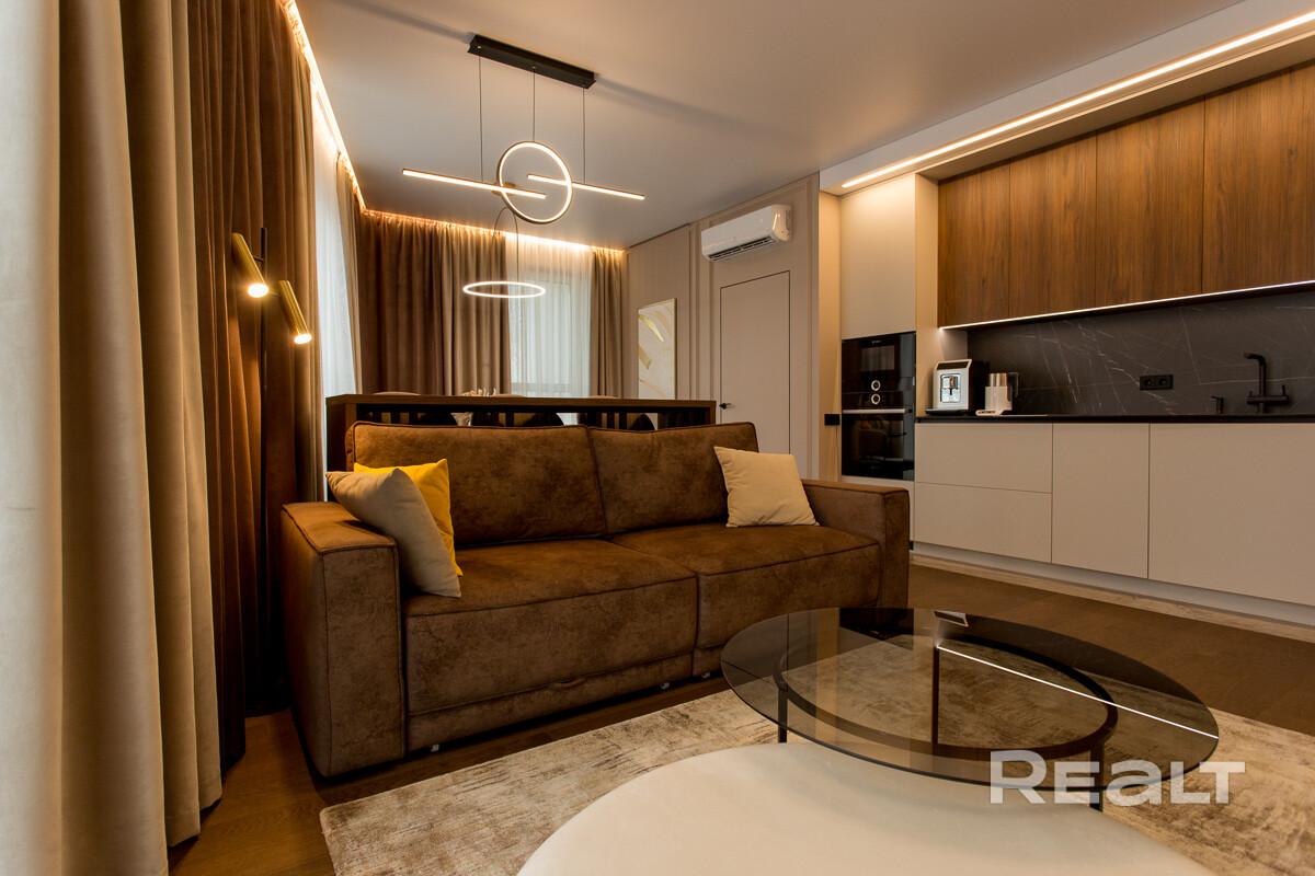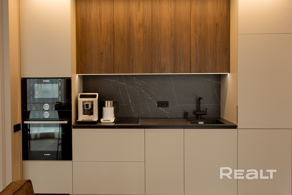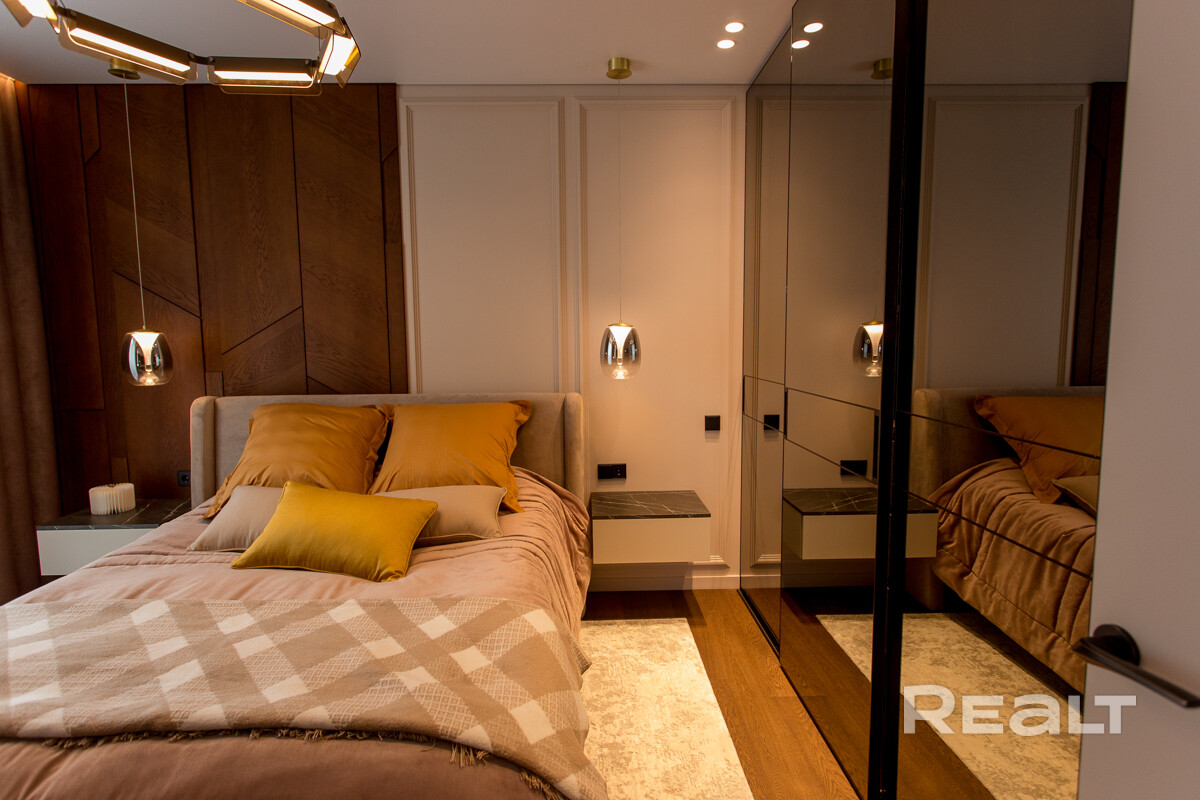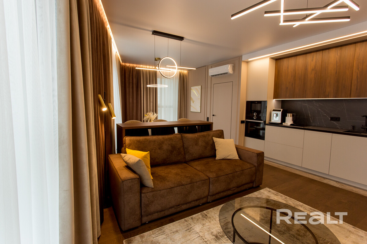 Квартира находится в престижном комплексе Minsk World, в непосредственной близости от Международного финансового центра, станции метро "Аэродромная" и торгово-развлекательного центра "Авиа Молл". Окна квартиры выходят на прекрасный вид, не упирающийся в соседние дома.