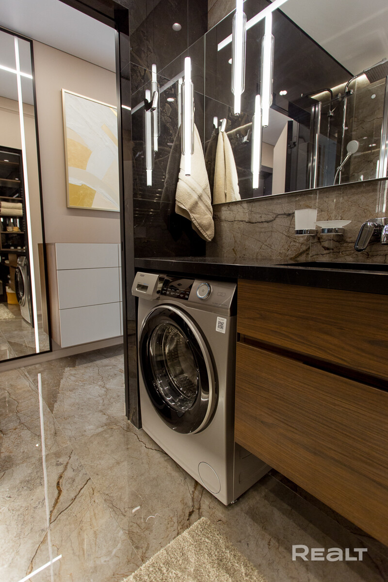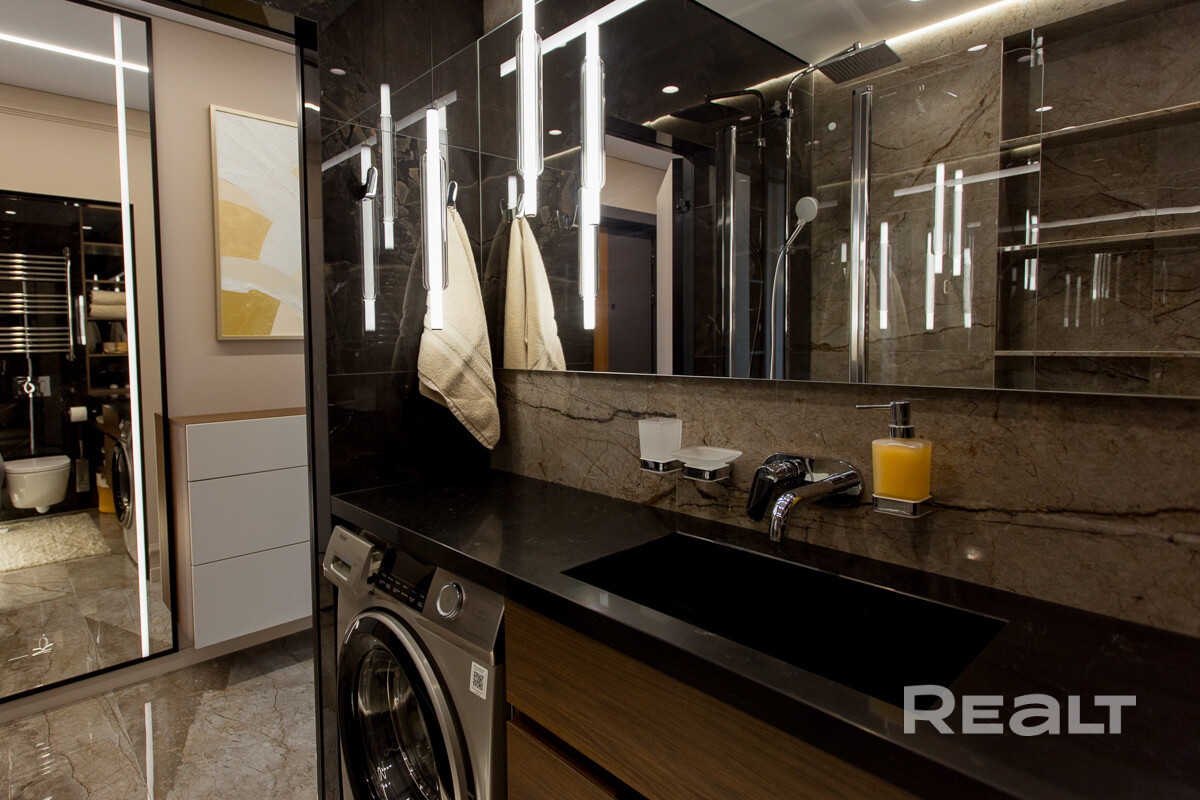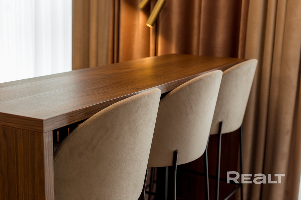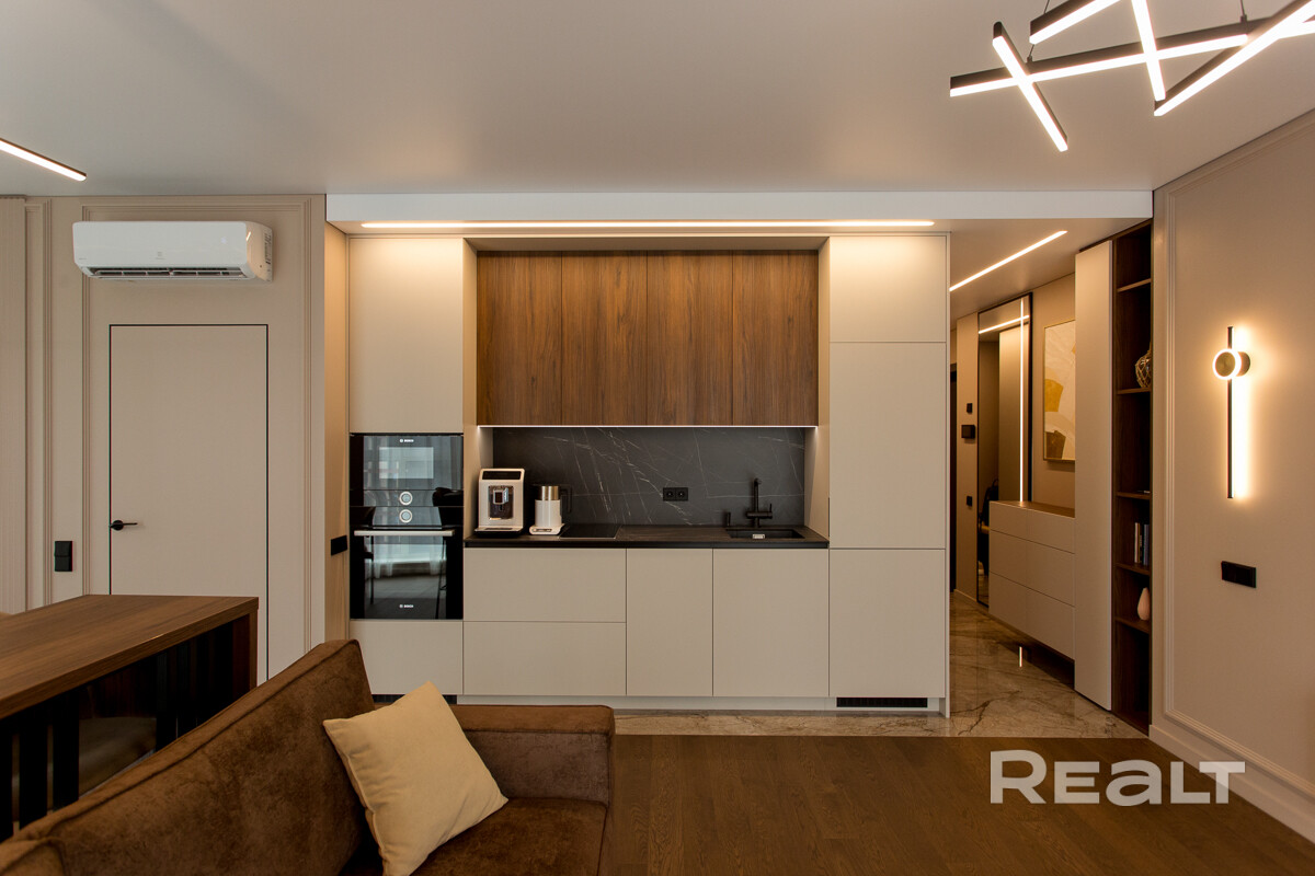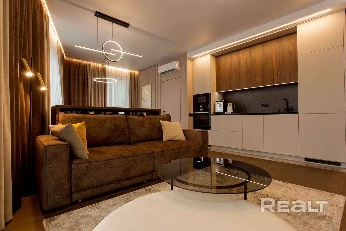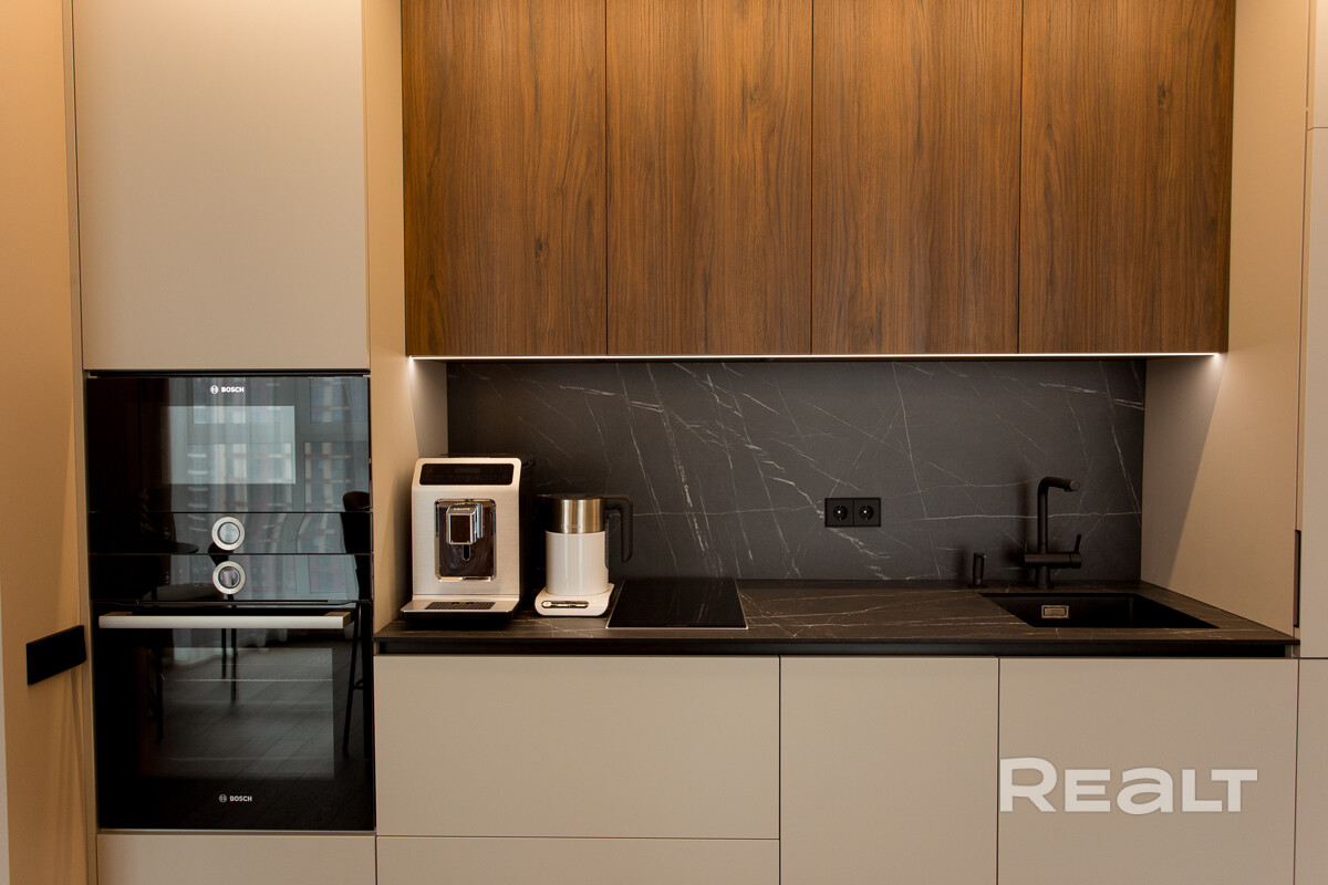 Квартира находится в престижном комплексе Minsk World, в непосредственной близости от Международного финансового центра, станции метро "Аэродромная" и торгово-развлекательного центра "Авиа Молл". Окна квартиры выходят на прекрасный вид, не упирающийся в соседние дома.