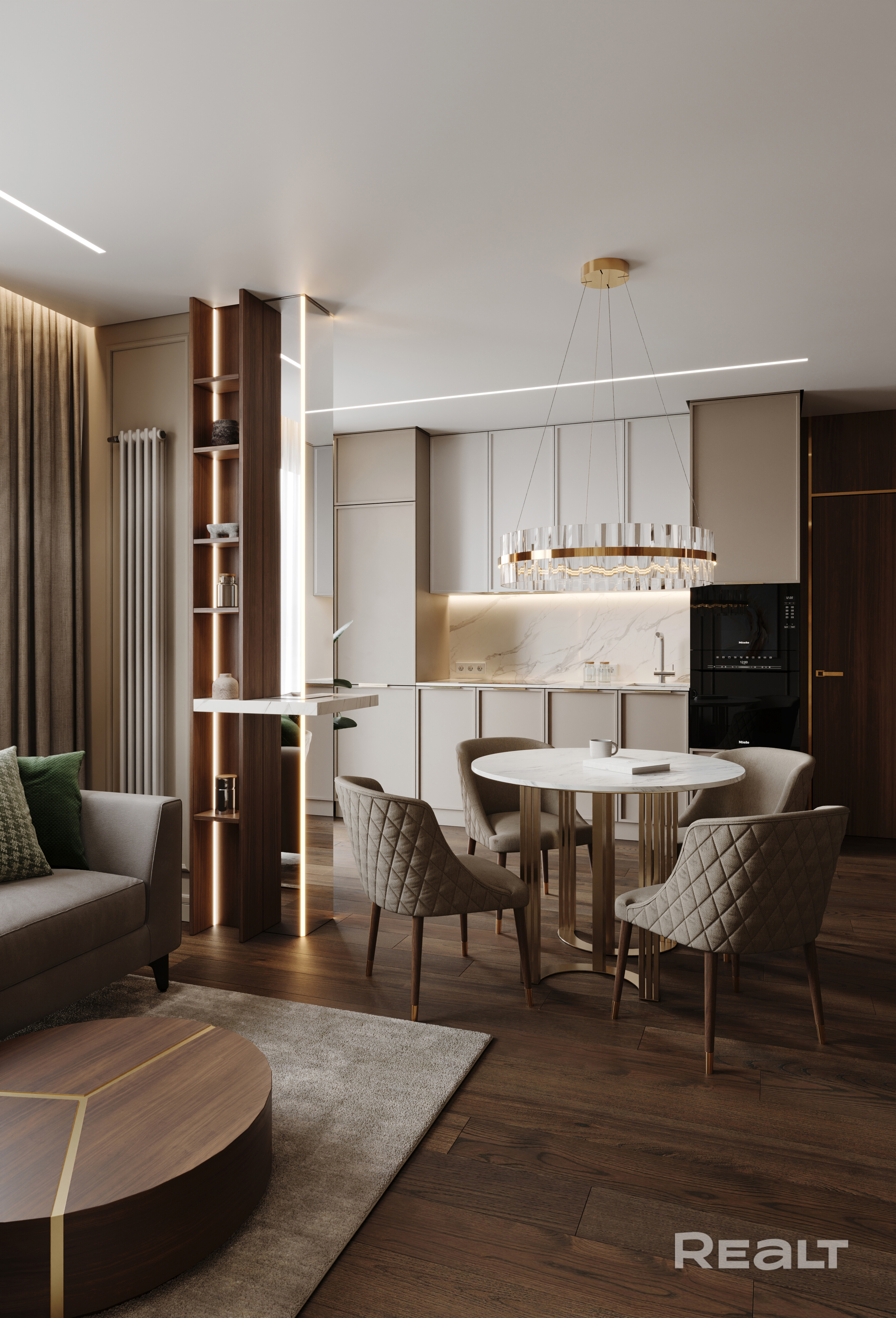 Кухня оборудована современной техникой от ведущих производителей: духовой шкаф, варочная панель, микроволновая печь, посудомоечная машина и холодильник. В ванных комнатах установлена сантехника Hansgrohe и Villeroy Boch, а также керамогранит премиум-класса.