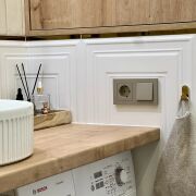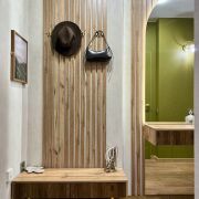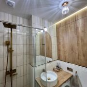 материалы: керамогранит под мрамор, декоративная штукатурка, реечные подвесные потолки и светодиодная подсветка.