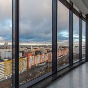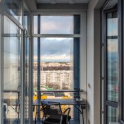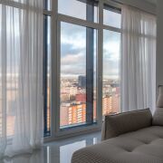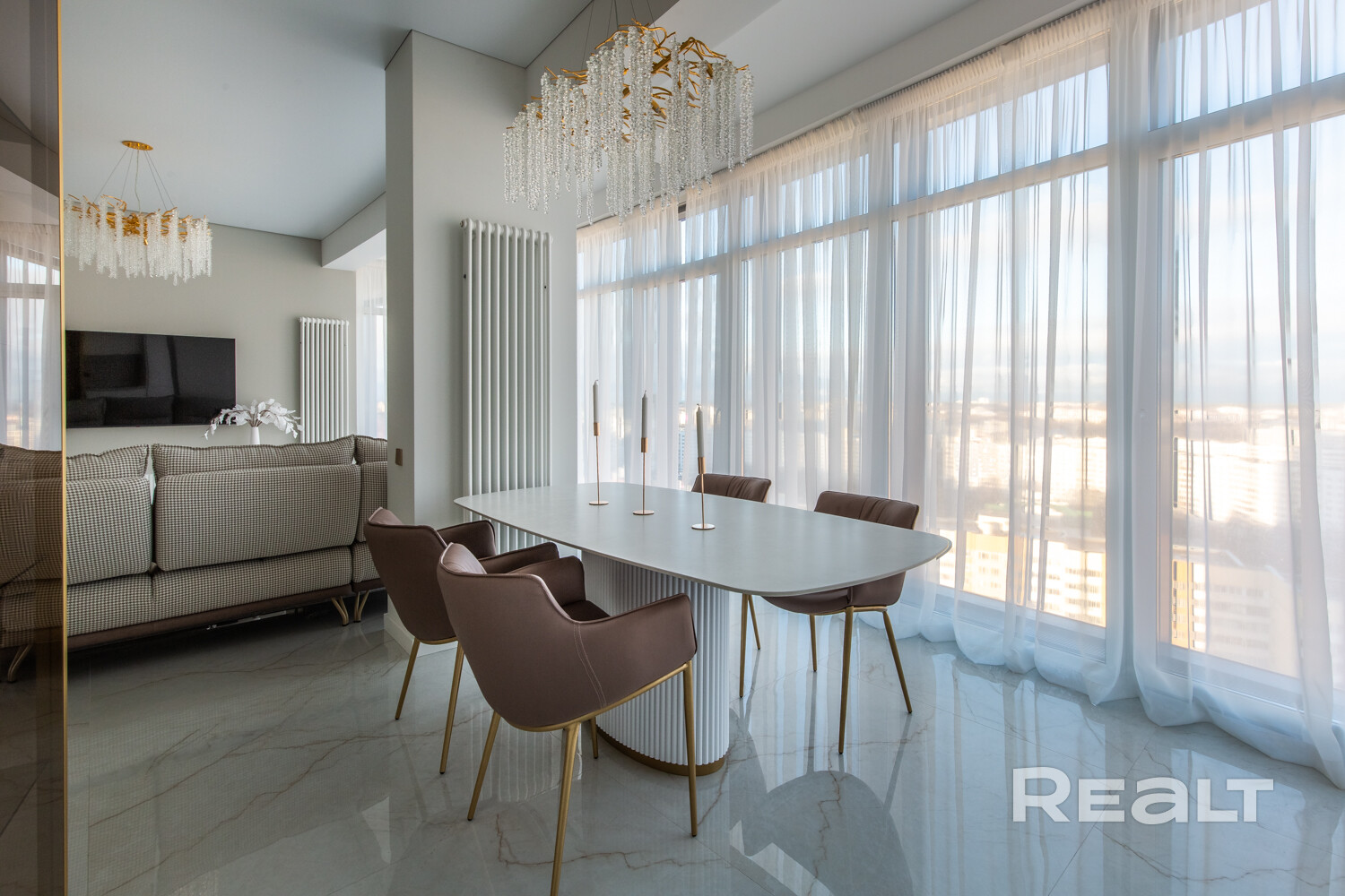 Панорамные окна в пол с захватывающим видом на центр Минска. Восхитительные рассветы из гостиной с кухней и живописные закаты в спальне.