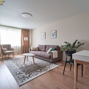 Квартира состоит из жилой комнаты с выделенной рабочей зоной, большой кухни и гардеробной. Раздельный санузел. Застекленный балкон.