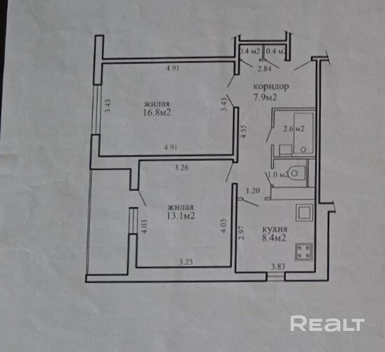Отличная планировка, по СНБ 52,8 кв.м., общая 50,6 кв.м, 2 раздельные комнаты 16,8 кв.м и 13.1. Высота потолков 2,63.