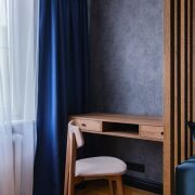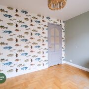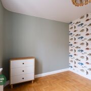 — Детская комната светлая, с нейтральной отделкой и акцентной стеной — легко адаптируется под возраст и интересы ребёнка.