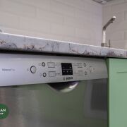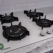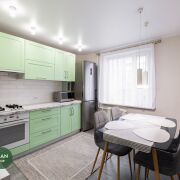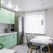 Современный гарнитур в спокойных оттенках, качественная встроенная техника: газовая варочная панель, духовой шкаф, посудомоечная машина Bosch. Продумана рабочая зона и обеденное пространство. Аккуратная отделка, светло и уютно.