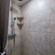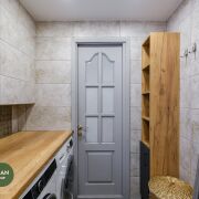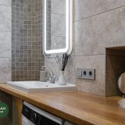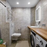 Совмещённый, с качественным современным ремонтом. Душевая зона формата walk-in, инсталляция, столешница из массива, стиральная и сушильная машины. Всё выглядит стильно и дорого, без компромиссов.