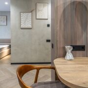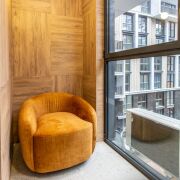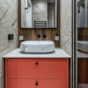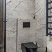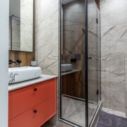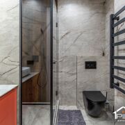 Санузел оформлен в единой стилистике с квартирой: качественные материалы, аккуратная геометрия и тёплый цветовой акцент создают цельное и современное пространство. Предусмотрен подогрев пола, что повышает комфорт в повседневном использовании.