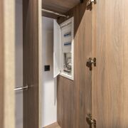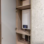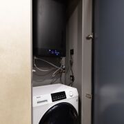 В нише за зеркалом скрыты стиральная машина с функцией сушки и большой накопительный бойлер с Wi-Fi управлением. Такое решение позволяет сохранить эстетику интерьера и при этом иметь полноценное инженерное оснащение.