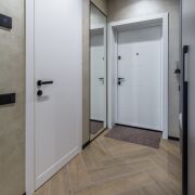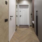 Коридор организован аккуратно и логично. Здесь размещены встроенные шкафы и ниши, позволяющие поддерживать порядок без лишних предметов на виду.