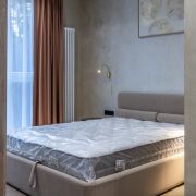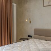 Натяжные потолки выполнены с теневым профилем, подчёркивающим геометрию пространства. Стены оформлены декоративной штукатуркой, которая даёт мягкую фактуру и хорошо работает со светом. Напольное покрытие — качественная плитка производства Италии.