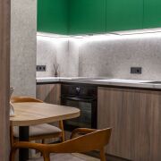 Кухонная зона выполнена со встроенной техникой Haier, рабочая поверхность дополнена фартуком и участком стены из керамогранита. Цветовые акценты на фасадах выглядят мягко и гармонично, не перегружая пространство.
