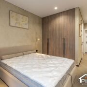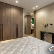 В спальне установлен вместительный встроенный шкаф с лаконичными фасадами в тон отделки. Он полностью закрывает вопрос хранения одежды и при этом визуально не утяжеляет интерьер. Меблировка и освещение подобраны так, чтобы спальня ощущалась уютной и функциональной одновременно.