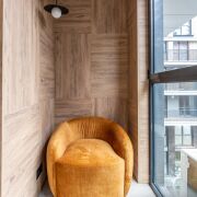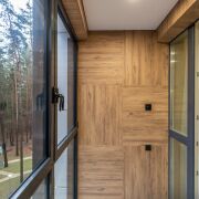 Лоджия с панорамным остеклением воспринимается как полноценное продолжение квартиры. Здесь предусмотрено освещение и тёплый пол, благодаря чему пространство можно использовать круглый год — для отдыха, работы или утреннего кофе с красивым видом на сосновый бор.