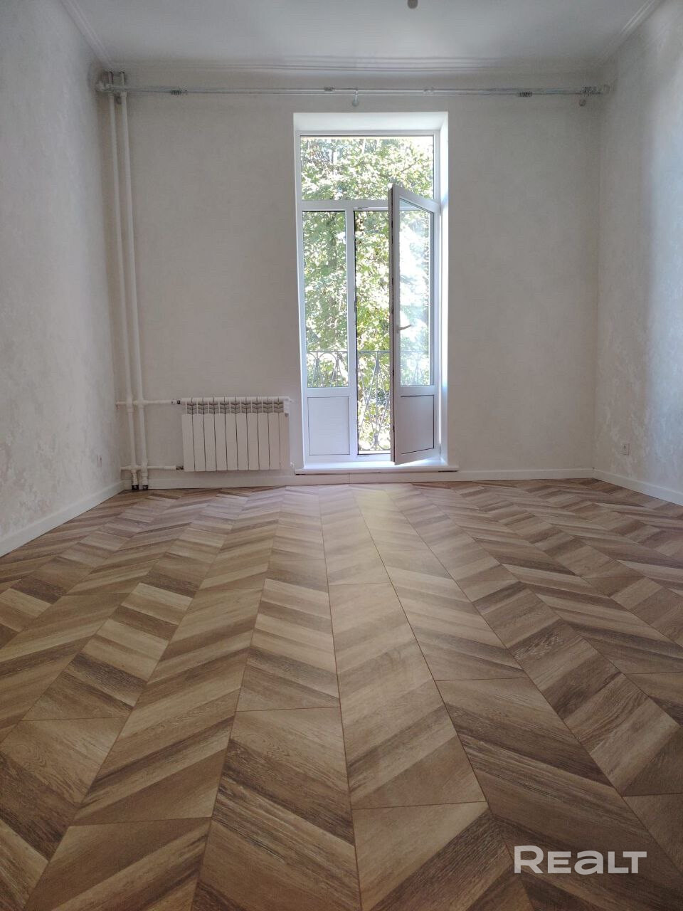Заменены все коммуникации - электрическая проводка, канализация, сантехника, газовые и электрические счётчики, сняты старые полы и сделана стяжка, уложена плитка и ламинат. Выровнены и оклеены стены. Квартира светлая, чистая. Окна выходят во двор. Сохранена оригинальная лепнина на потолках. Отсутствуют межкомнатные двери!