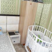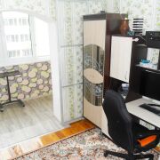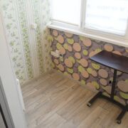 Дальняя комната имеет выход на лоджию. Здесь во время ремонта сделали полное утепление, установили пластиковый стеклопакет, провели электричество и освещение, подключили теплый пол с управлением по wi-fi, установили стеклянную раздвижную дверь.