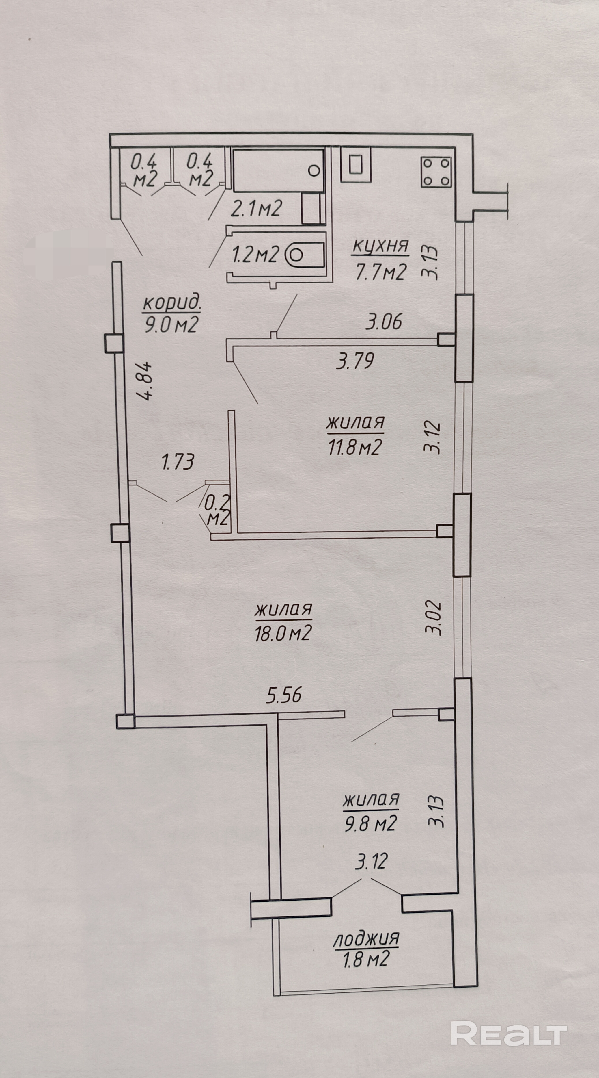 В квартире две изолированные комнаты (11,8 и 9,8 м.кв.) и одна проходная (18 м.кв.), кухня (7,7 м.кв.), раздельный санузел и большой коридор.