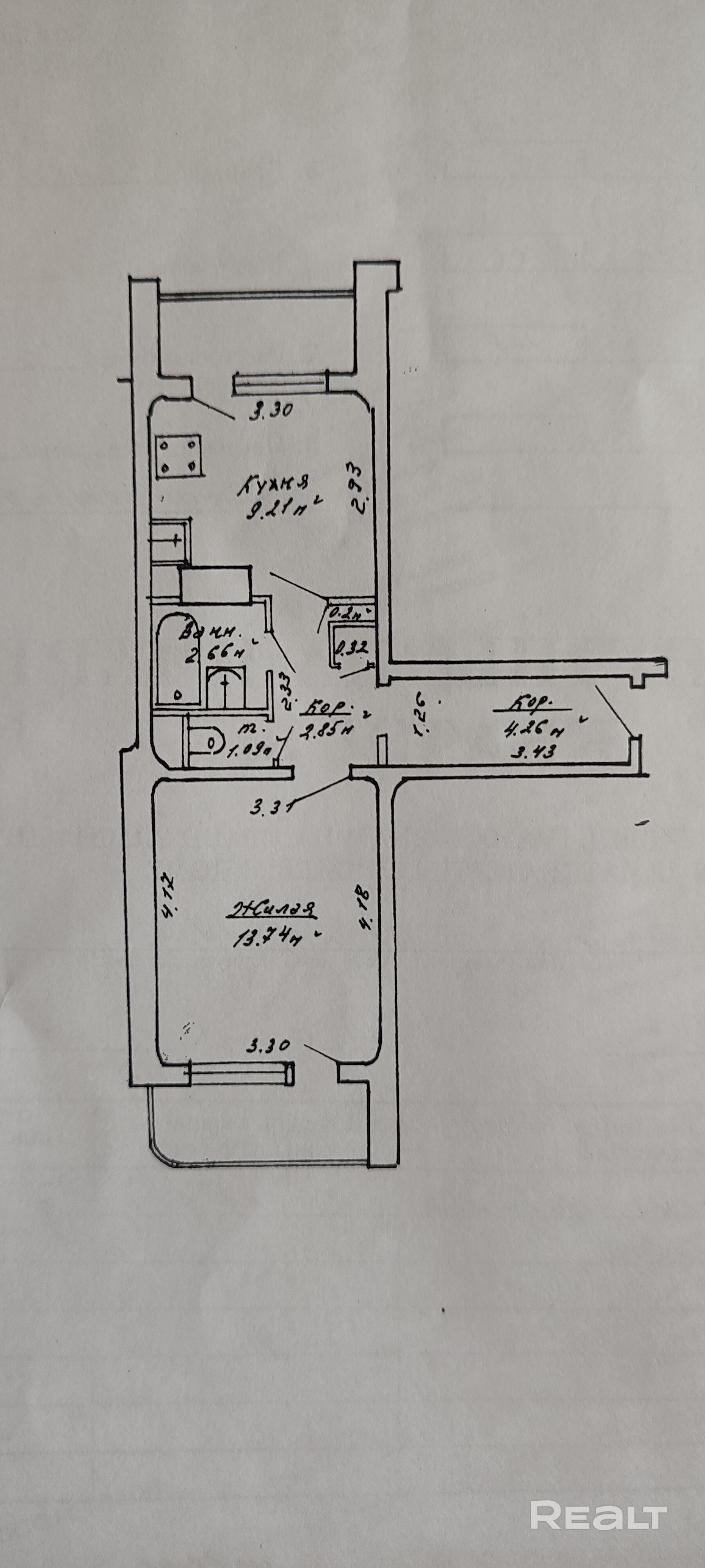 Площадь квартиры по СНБ  36.43 м. кв., кухня 9.21 м. кв., комната 13.74 м. кв, санузел раздельный.