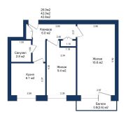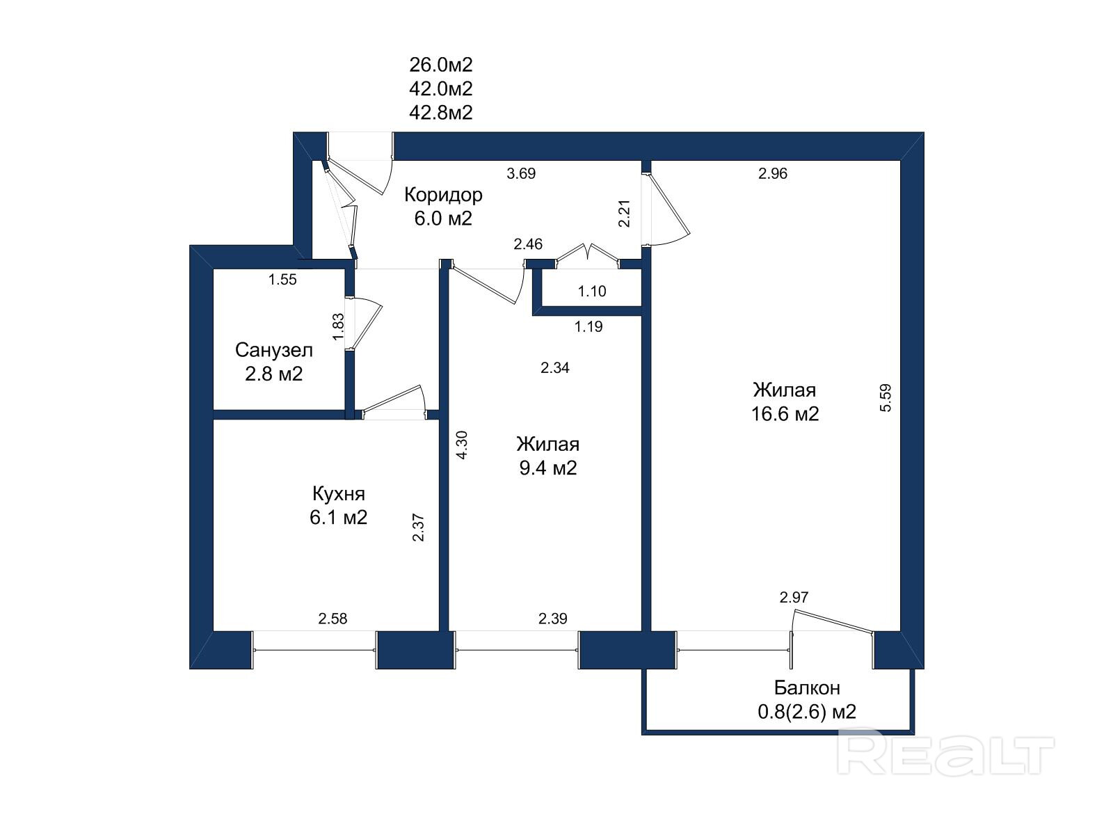 Площадь квартиры по СНБ-42,8 м2. Две жилые комнаты (16,6м2 /9,4 м2) и кухня 6,1м2 , в квартире совмещенный санузел.