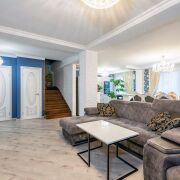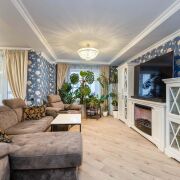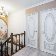 - Входная группа начинается с просторного холла со светлой отделкой и встроенными системами хранения. Крупное зеркало и продуманное освещение усиливают ощущение объёма и делают зону удобной для ежедневного использования. Переход между уровнями оформлен лестницей с деревянными элементами и художественным оформлением стены, логично встроенными в общее пространство квартиры.