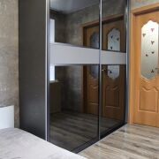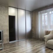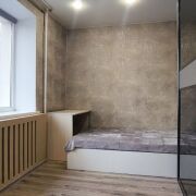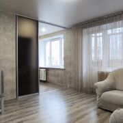 2 изолированные комнаты. Между кухней и гостиной организовано зонирование раздвижной перегородкой.