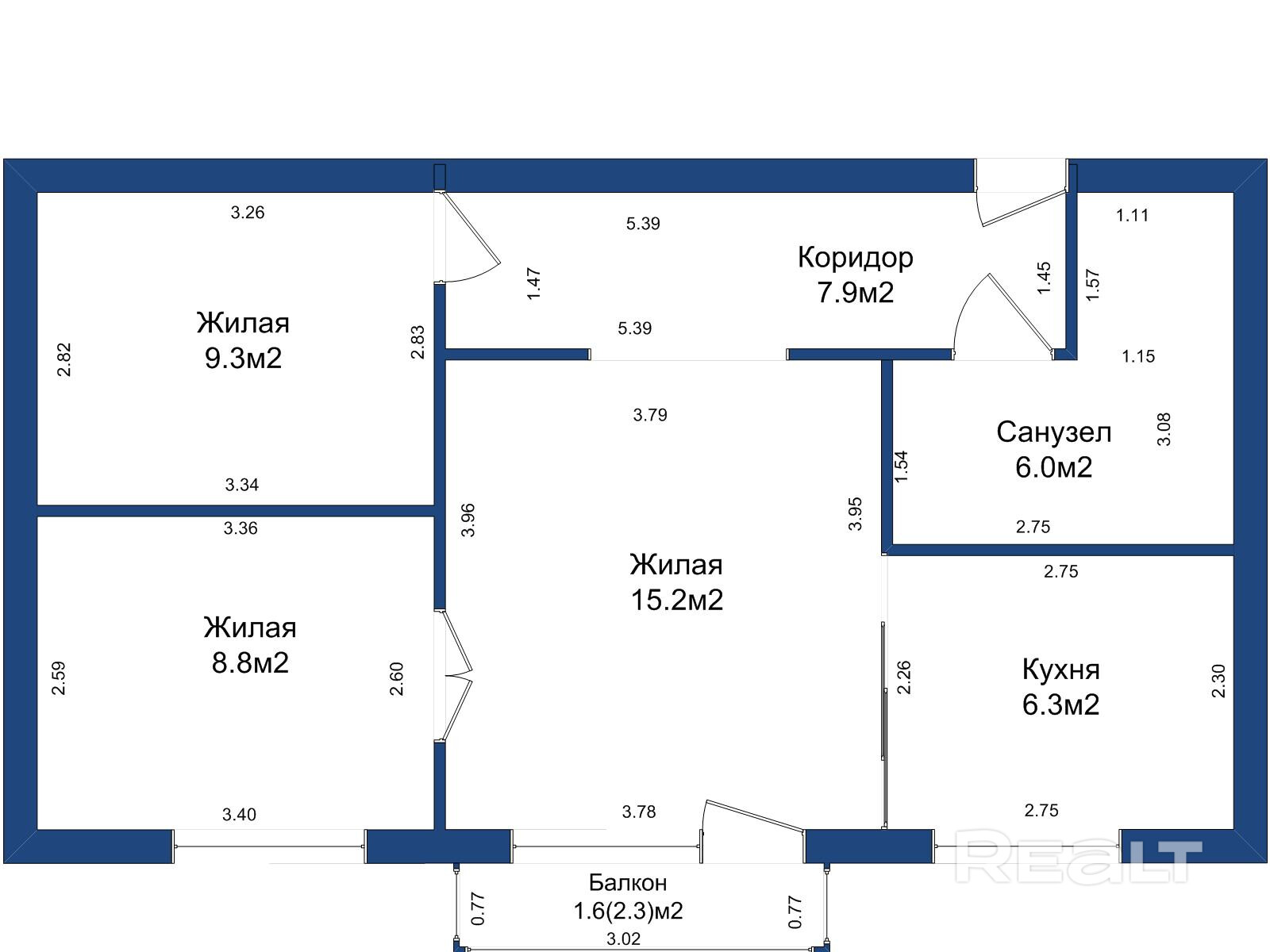 • Комнаты площадью - 15.2, 9.3 и 8.8 кв м